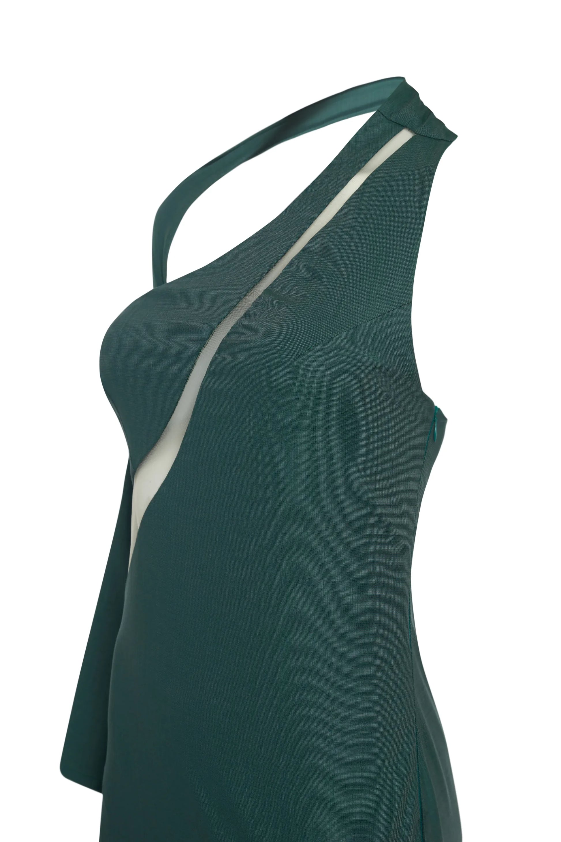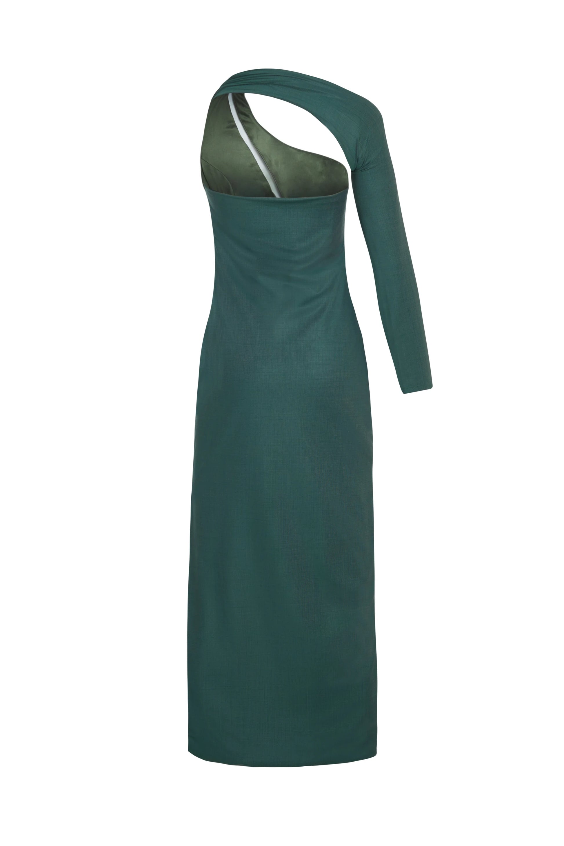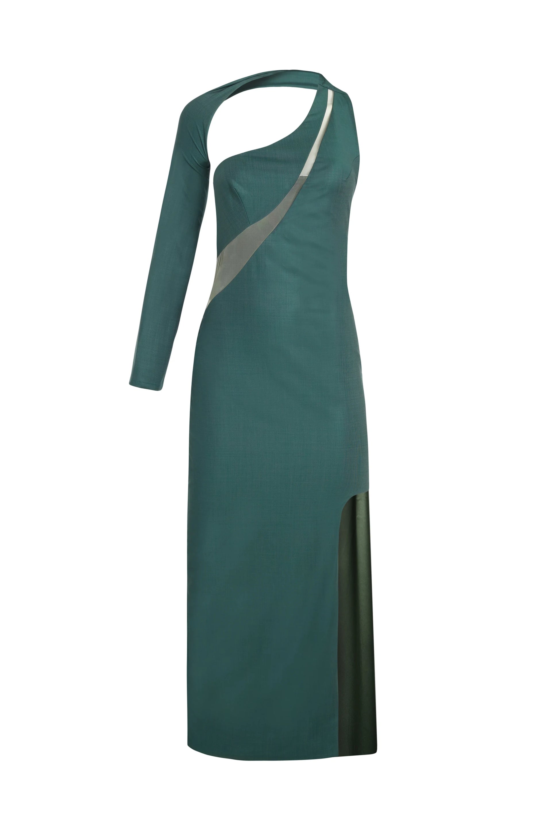 Bu tek kollu elbisede, bedenden yakaya kadar uzanan kol detayını görüyoruz. Sol omuzdan başlayıp çapraz olarak inen kısımda 2 cm açıklıklı şeffaf tül detay kullanılmıştır.