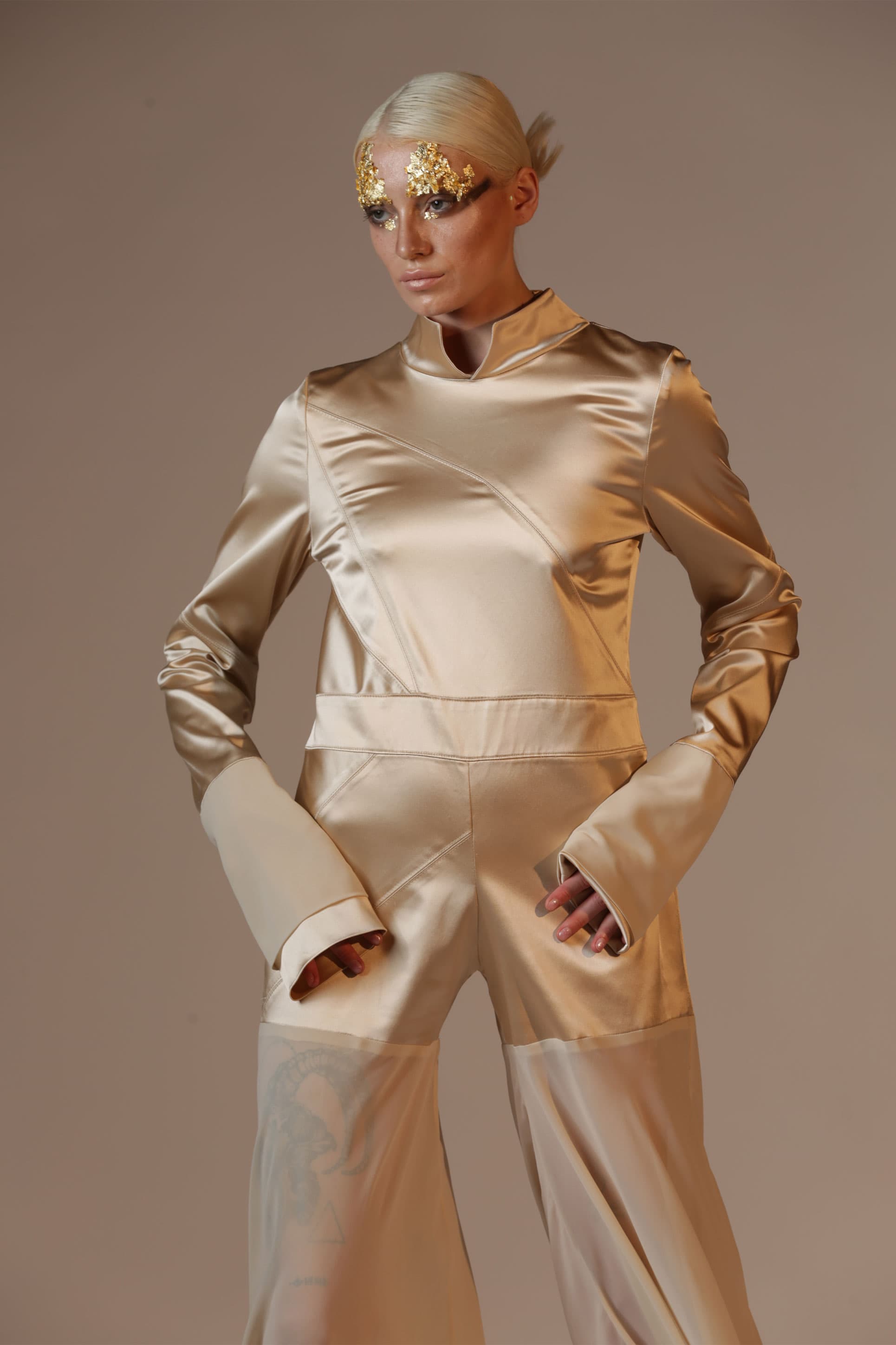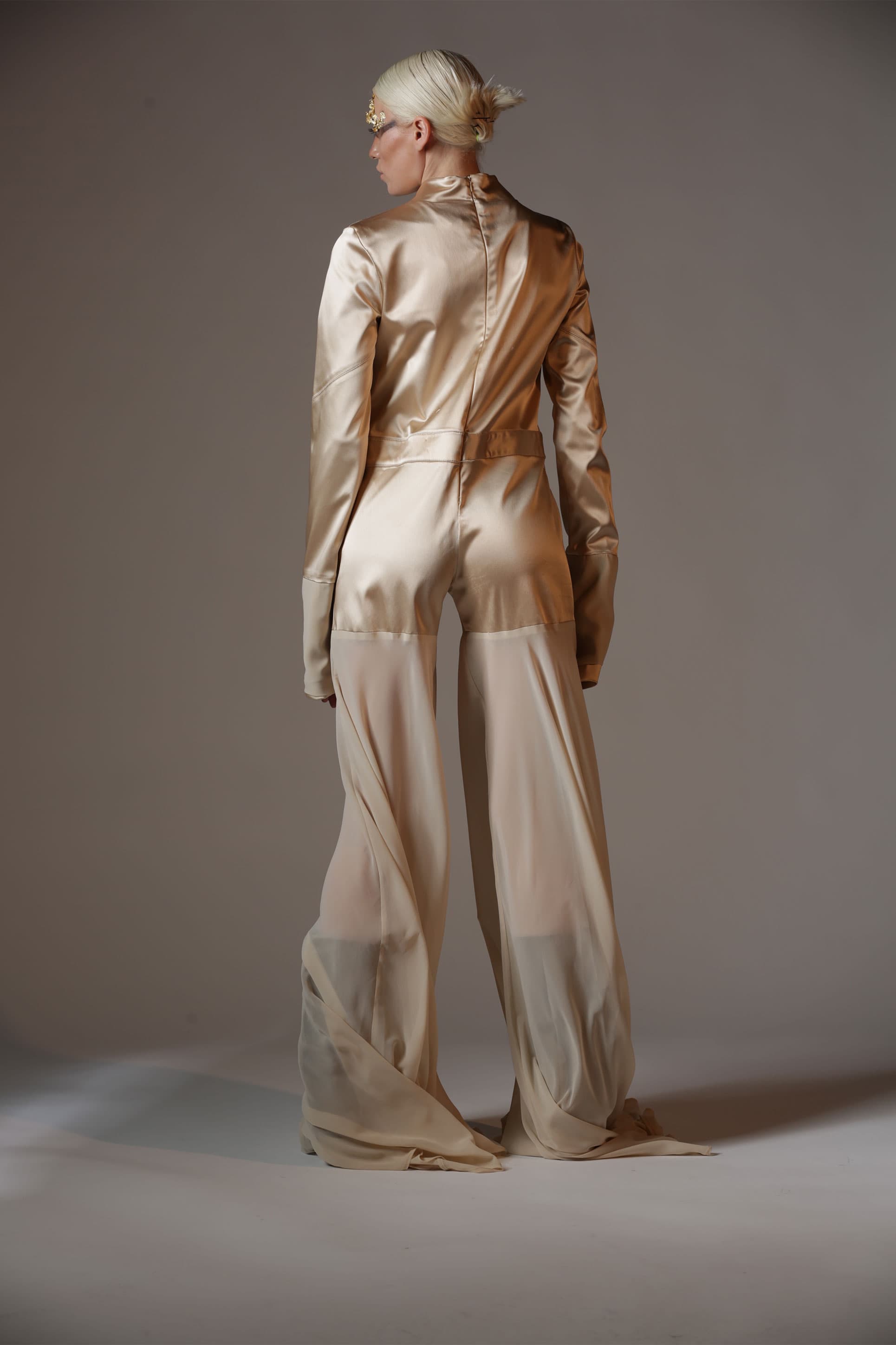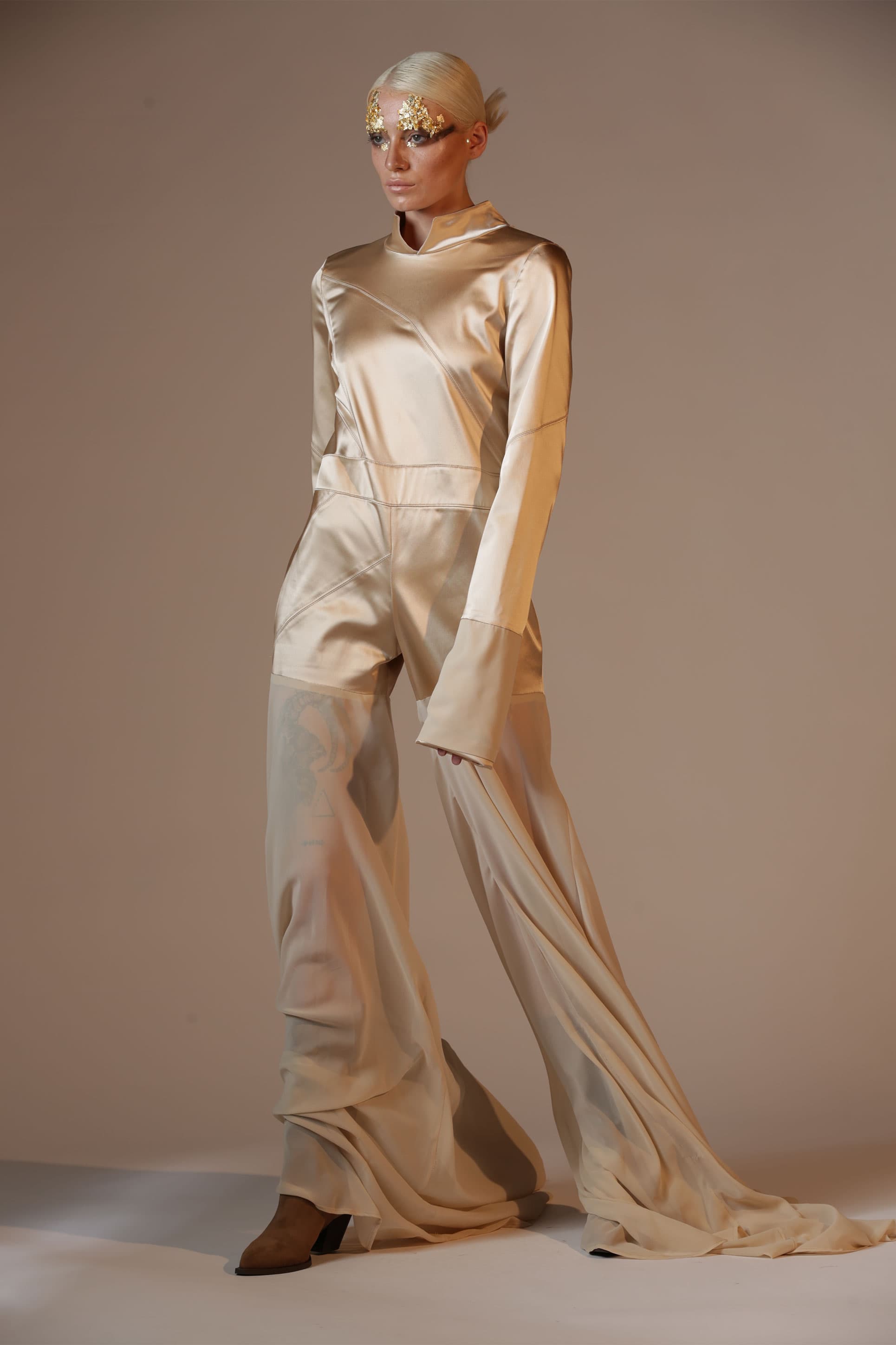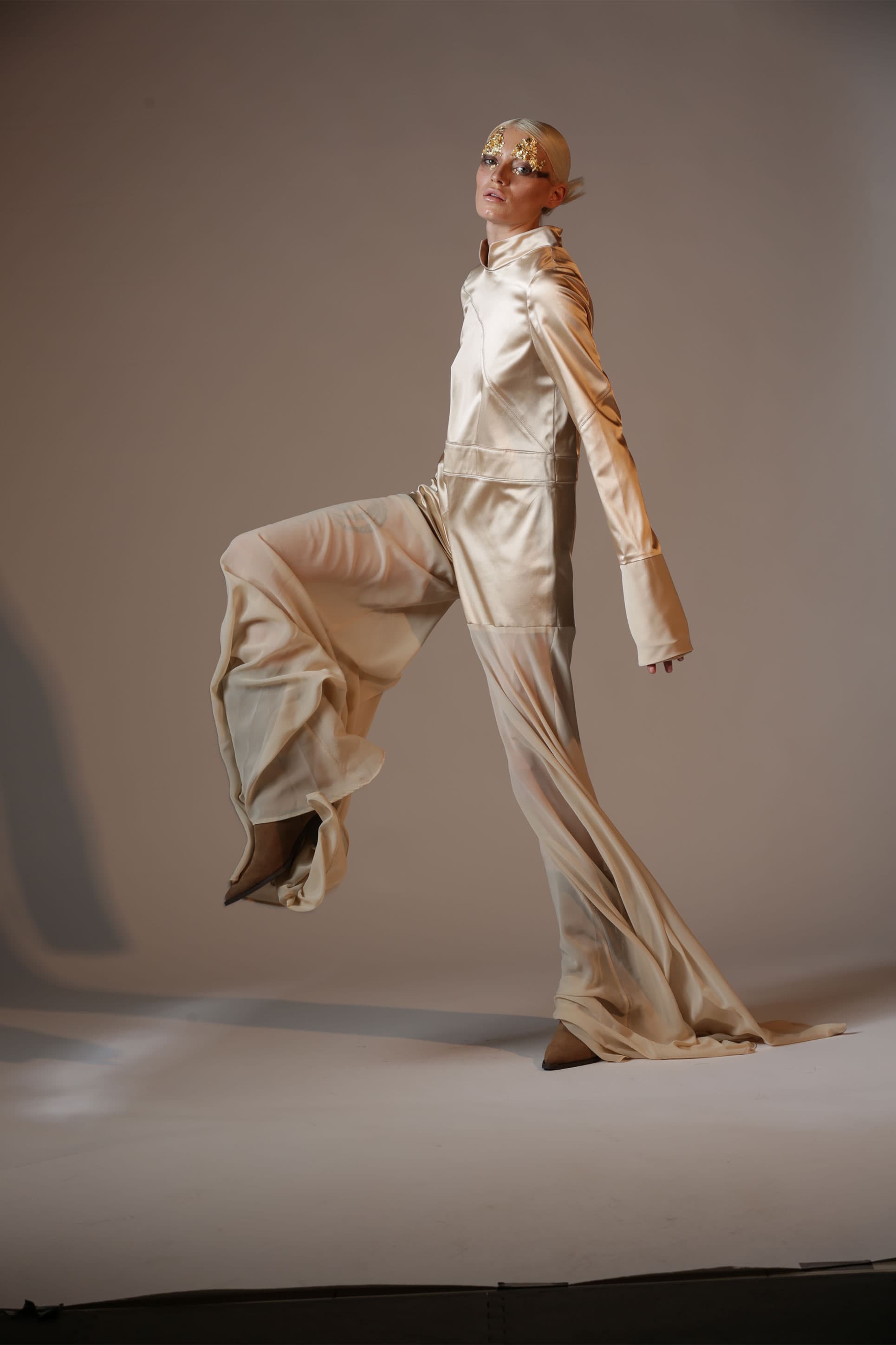 Daenerys, ipek şifon ve saten tafta kumaş kombinasyonuyla tasarlanmıştır. Tafta saten tulum, tamamen kesilmiş parçalardan yapılmış Şekil verirken etek uçları ve manşetler şifondan yapılmıştır.