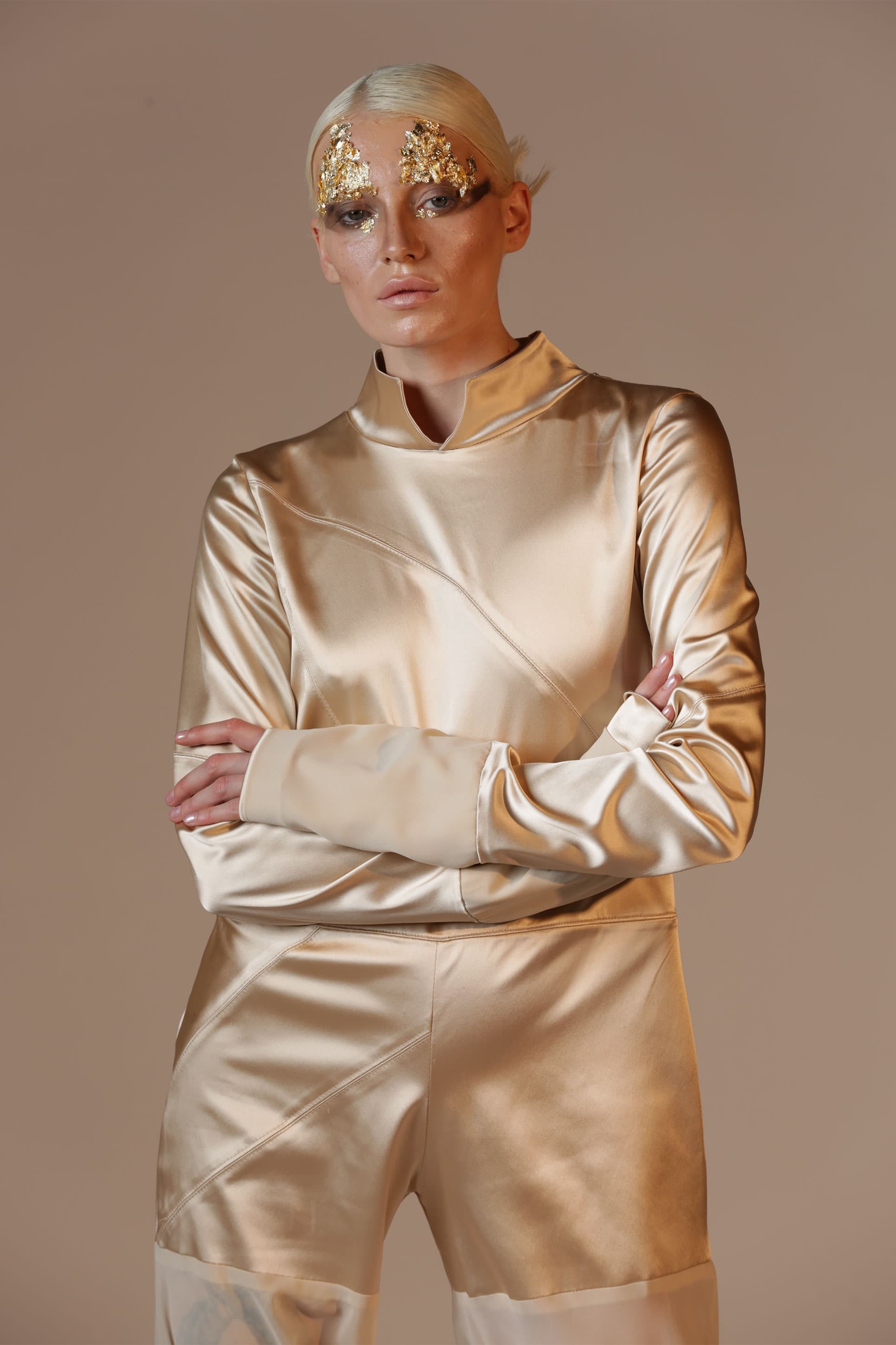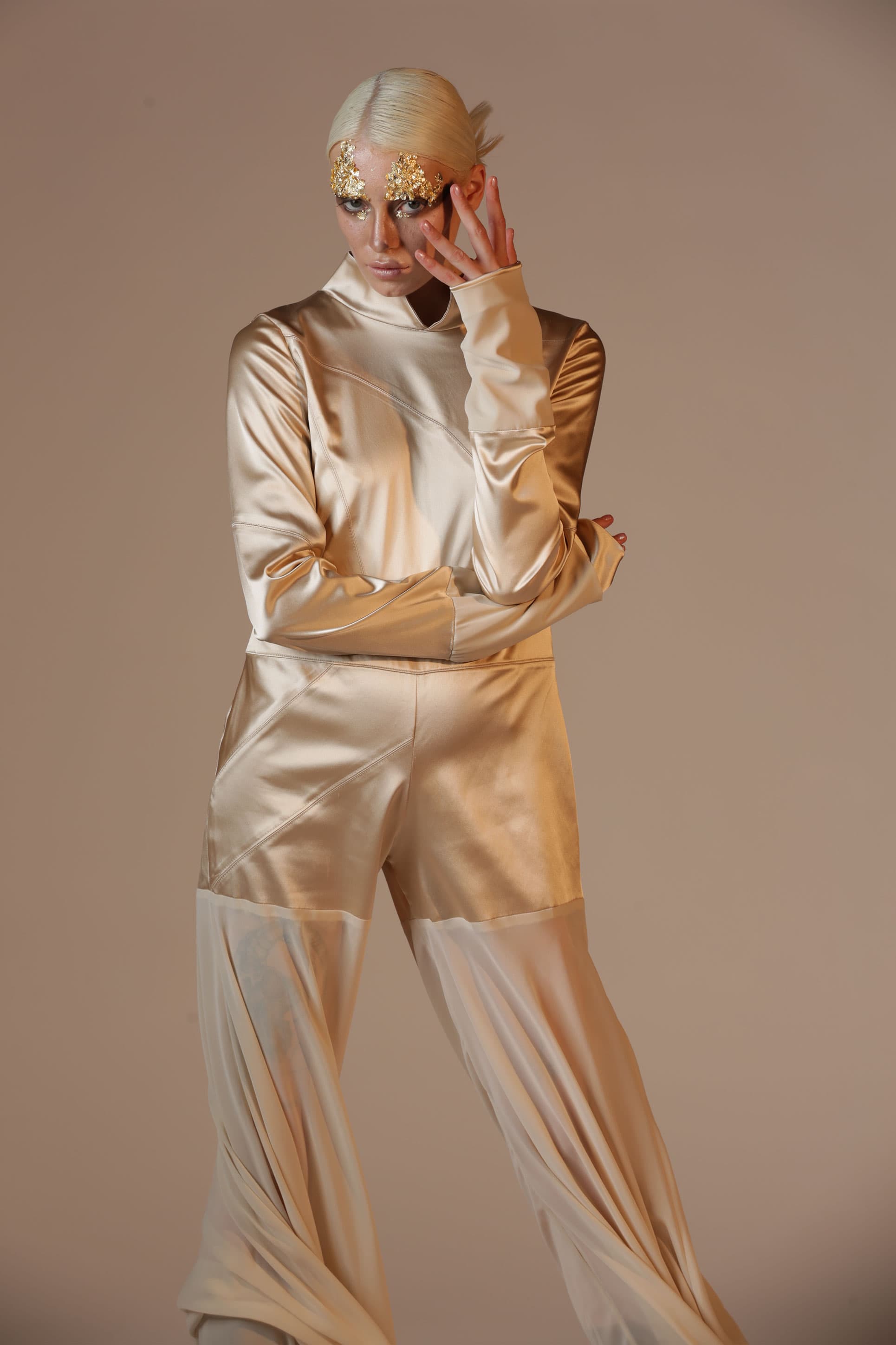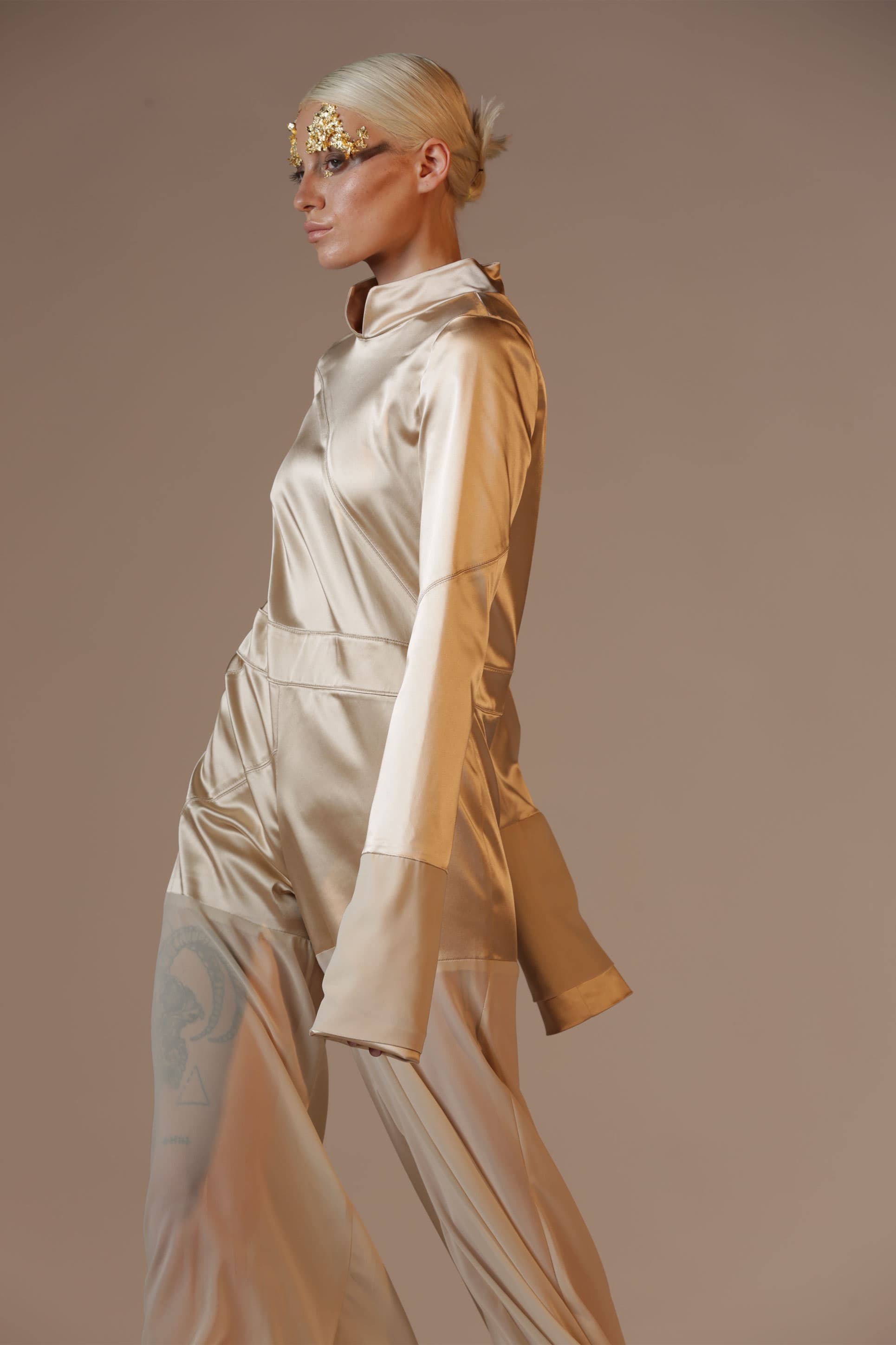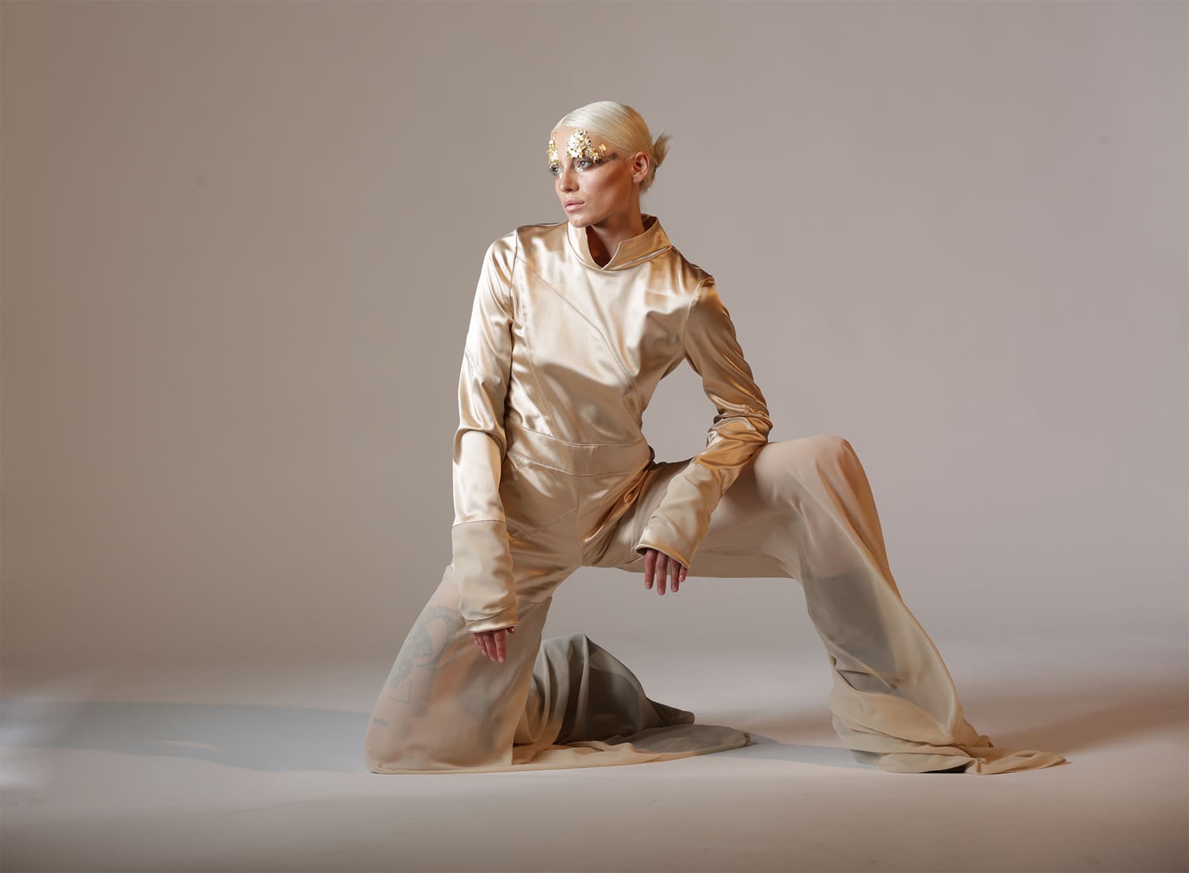 Daenerys, ipek şifon ve saten tafta kumaş kombinasyonuyla tasarlanmıştır. Tafta saten tulum, tamamen kesilmiş parçalardan yapılmış Şekil verirken etek uçları ve manşetler şifondan yapılmıştır.
