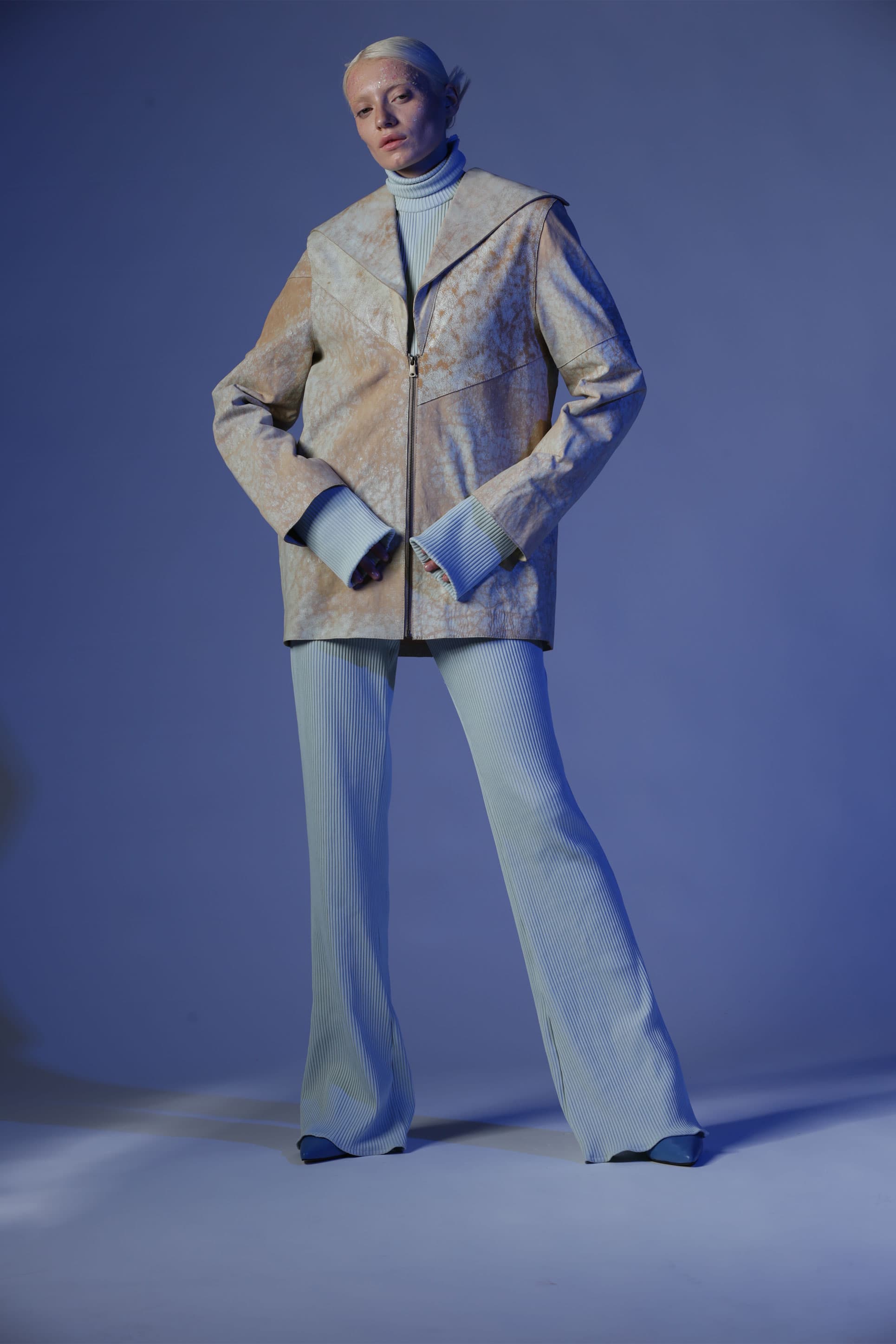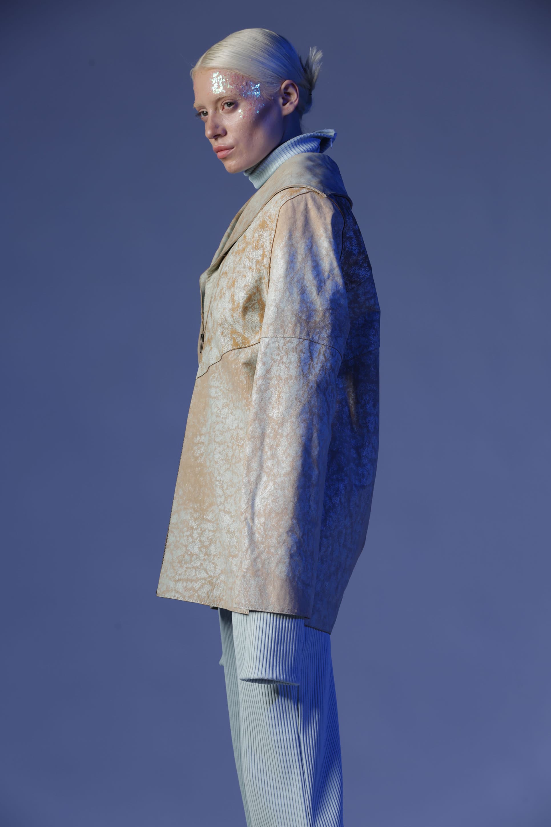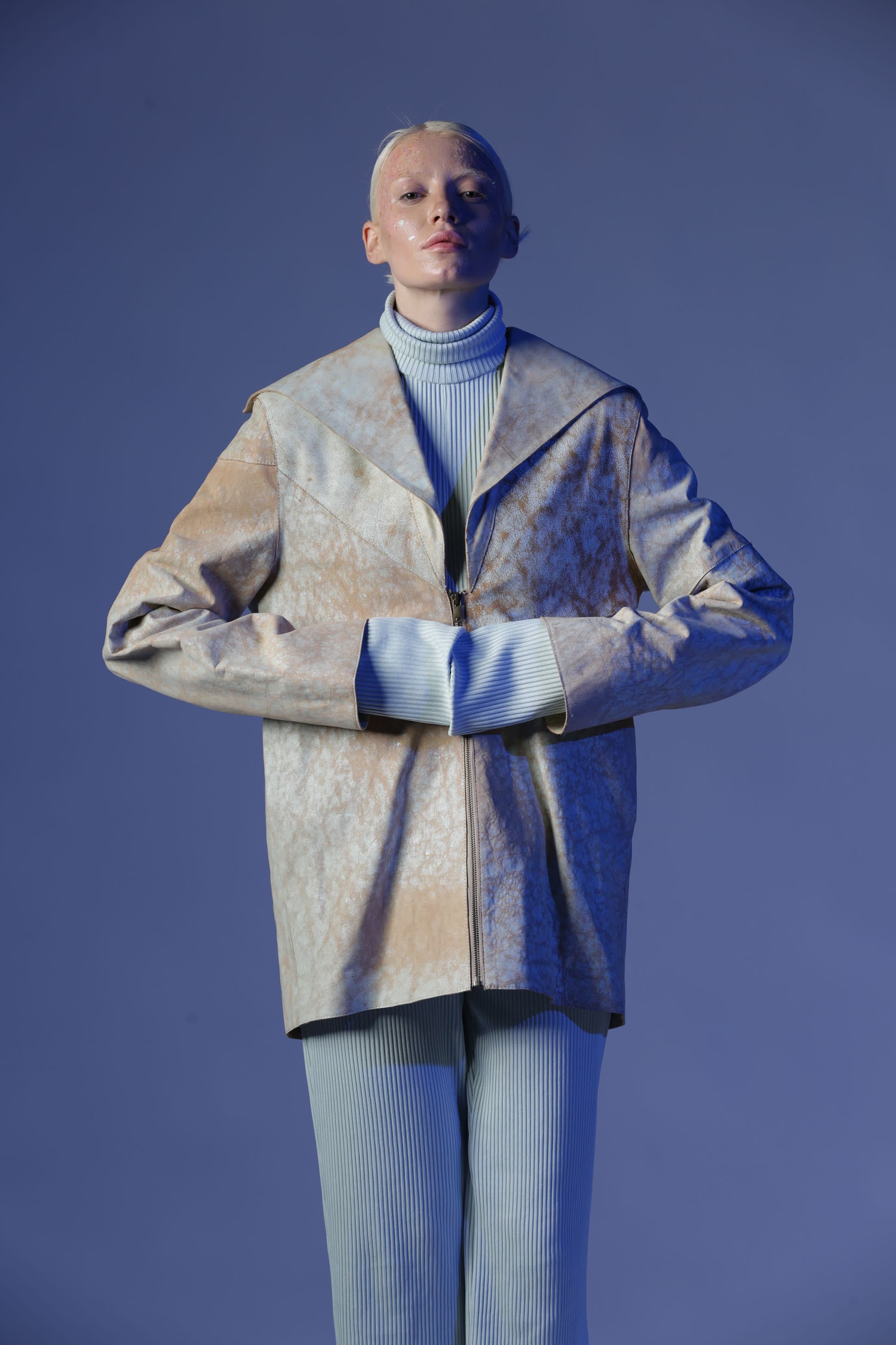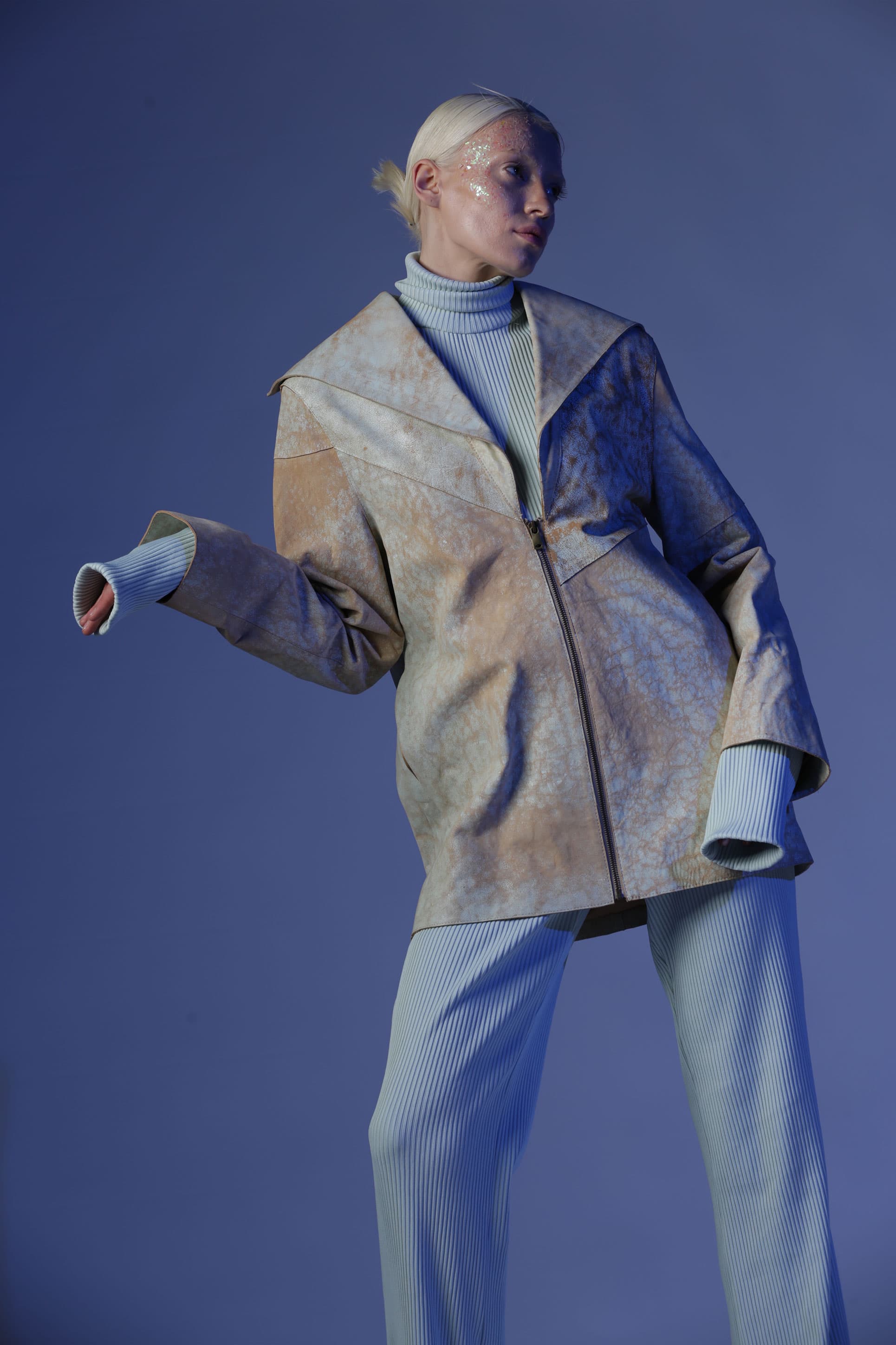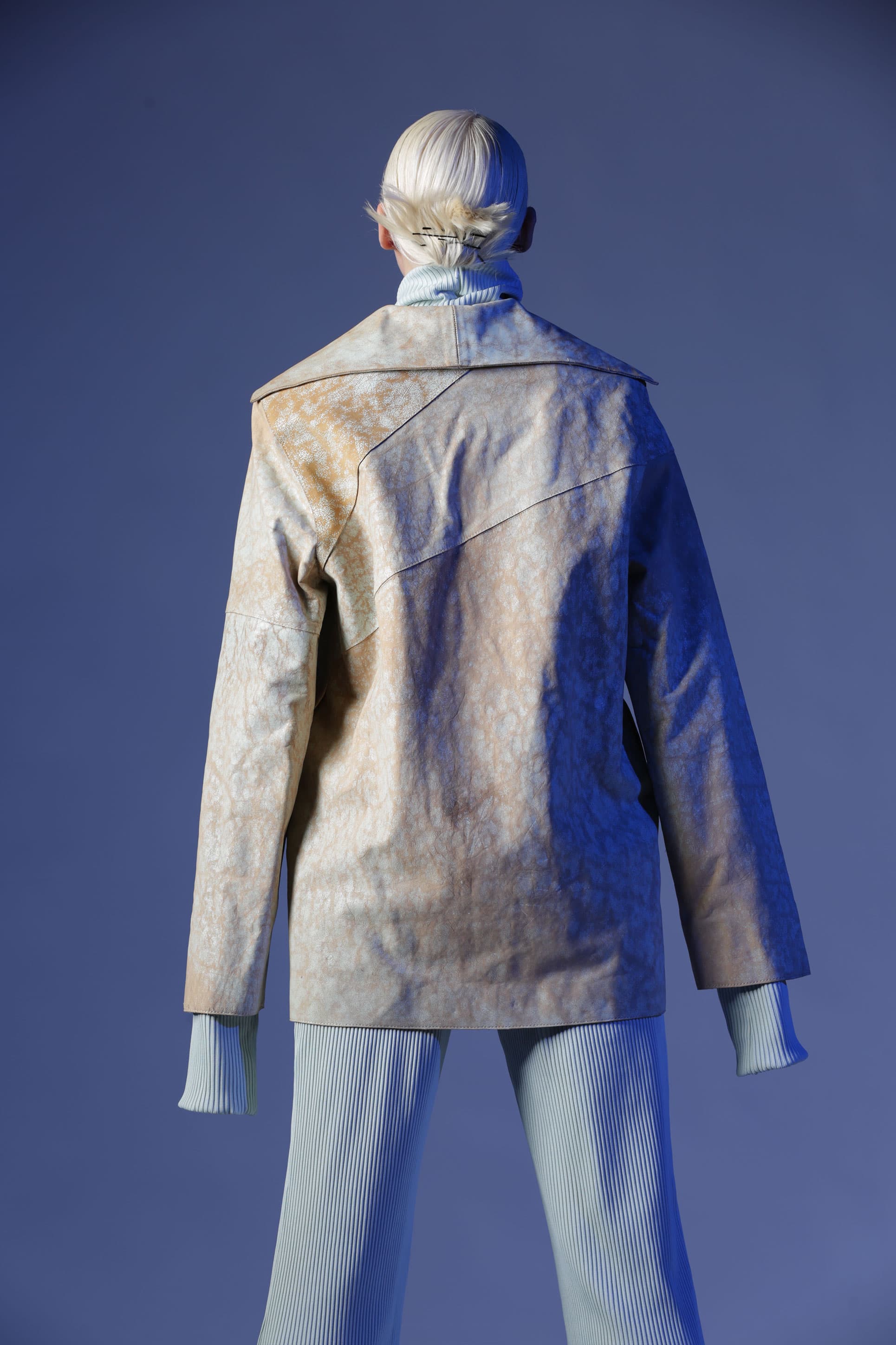 Birçok parçadan oluşan Gaia deri ceket, oversize bir cekettir. Öndeki geniş yaka bölümleri arkaya doğru devam ediyor. Deriye çatlama efekti verilir.