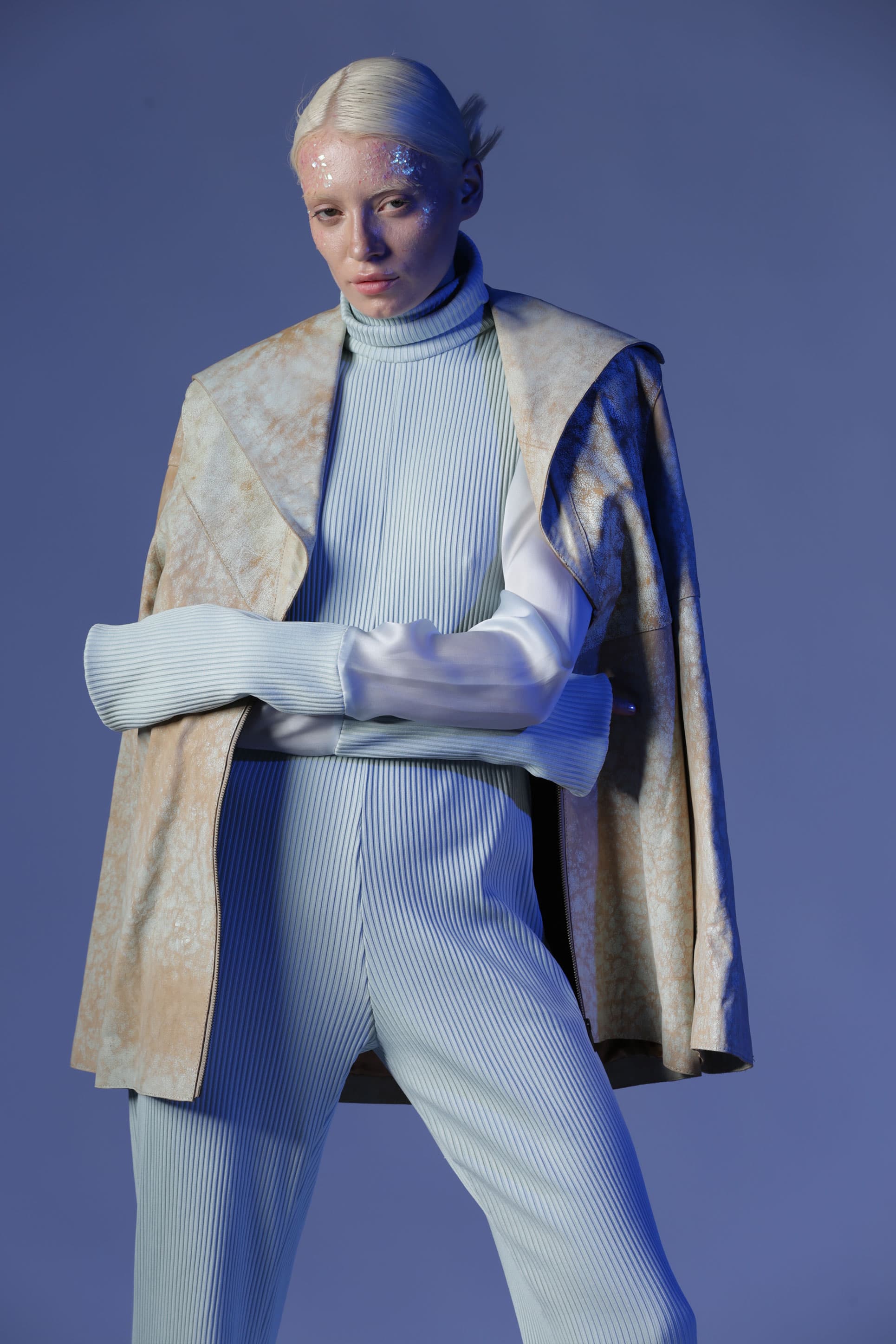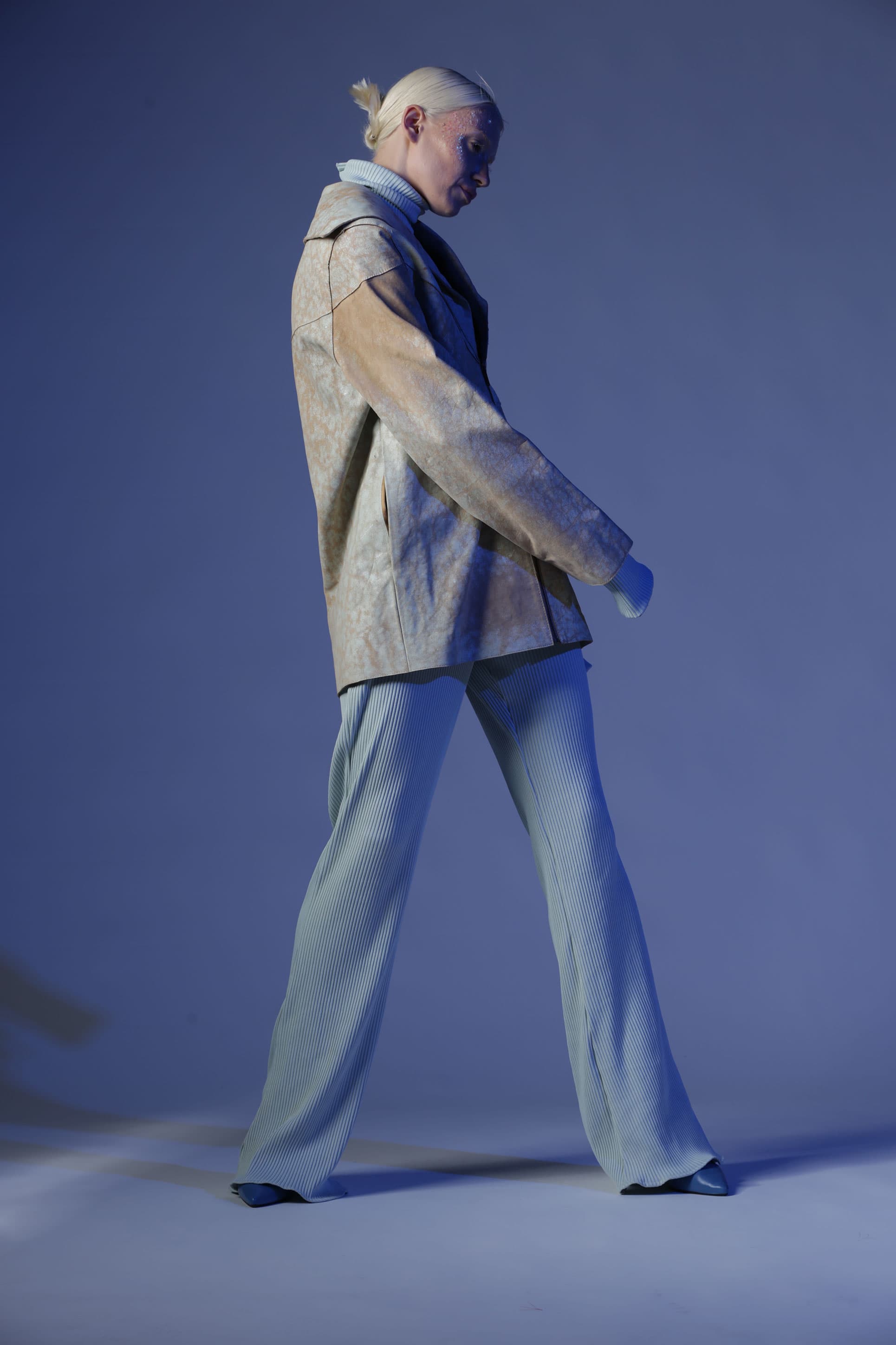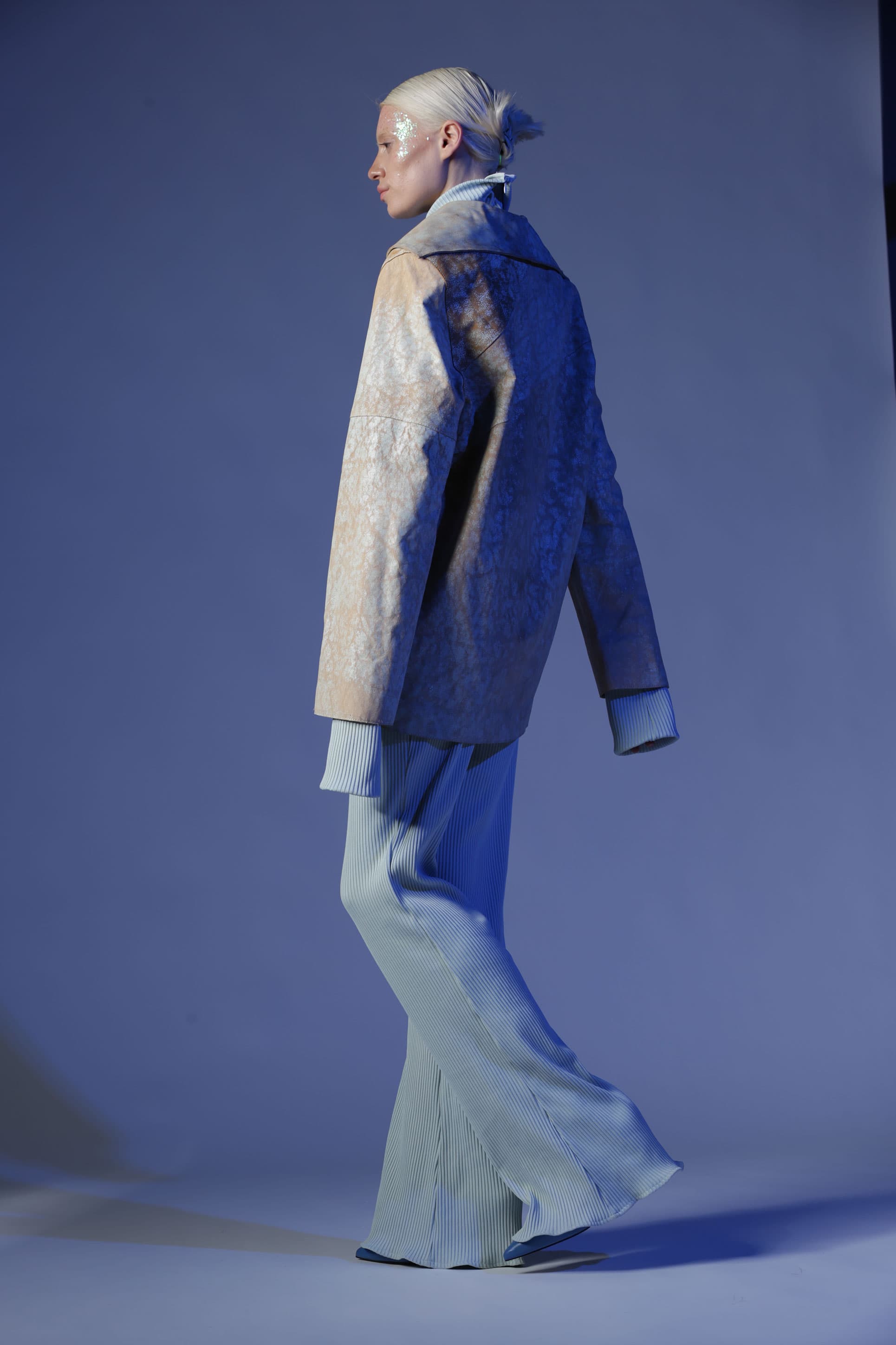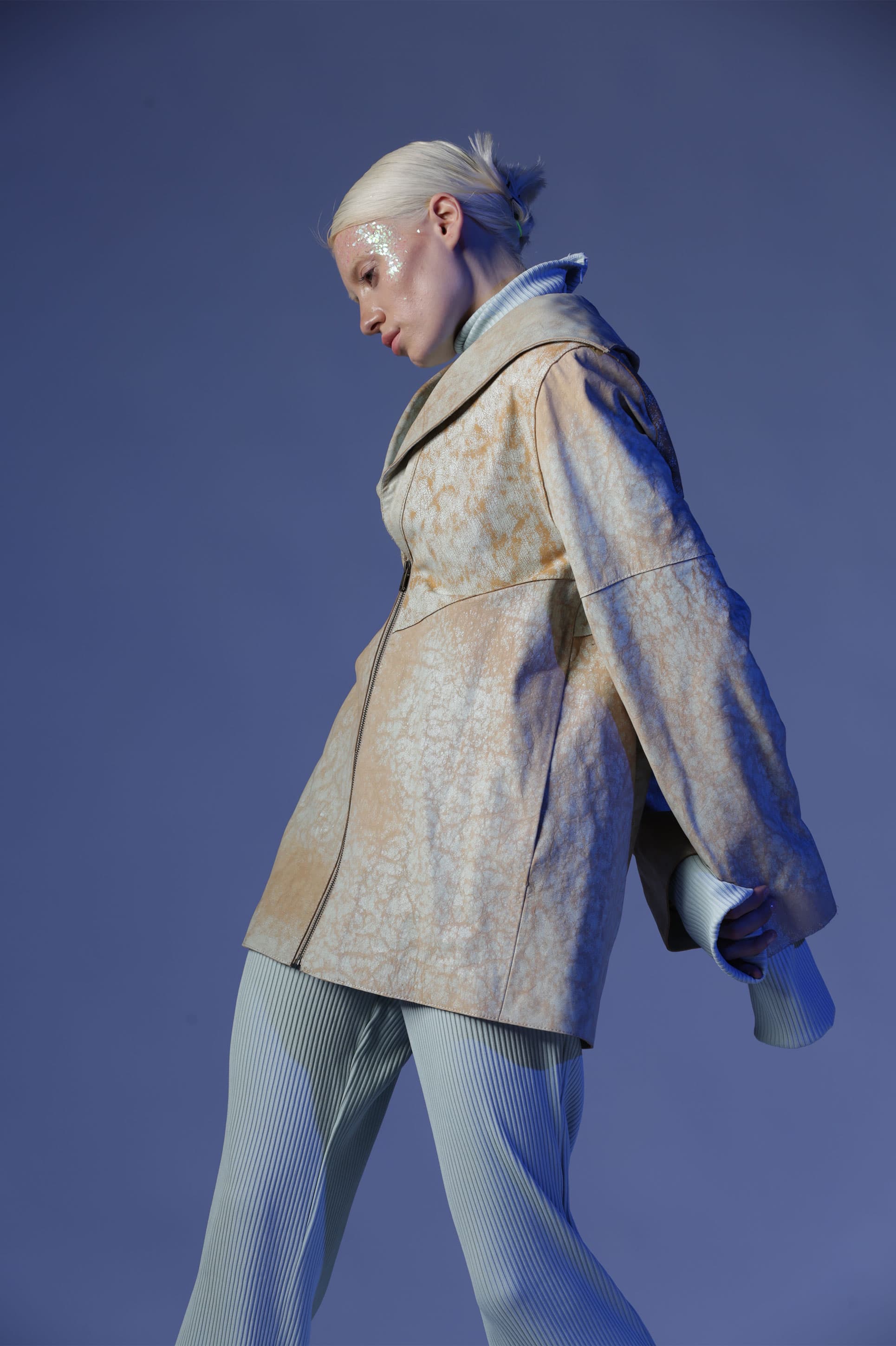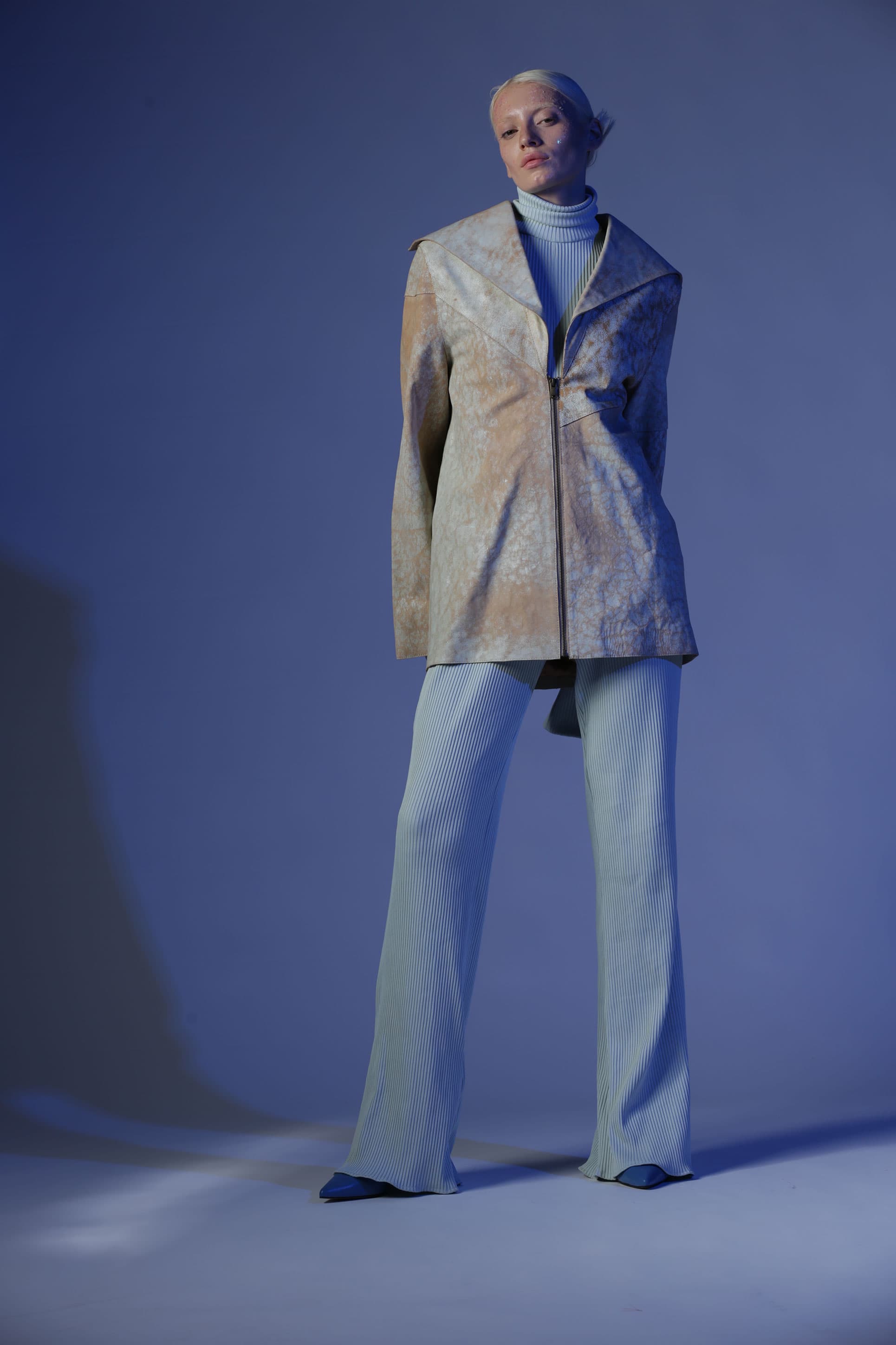 Birçok parçadan oluşan Gaia deri ceket, oversize bir cekettir. Öndeki geniş yaka bölümleri arkaya doğru devam ediyor. Deriye çatlama efekti verilir.