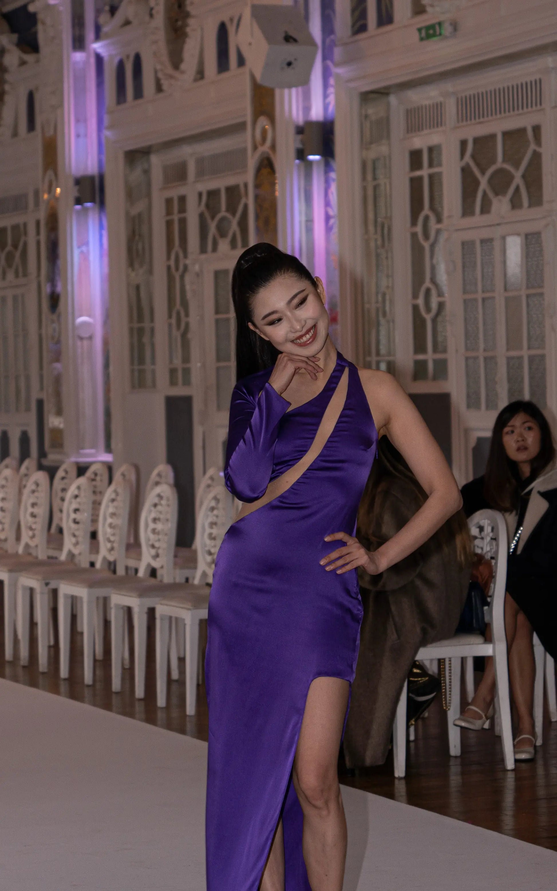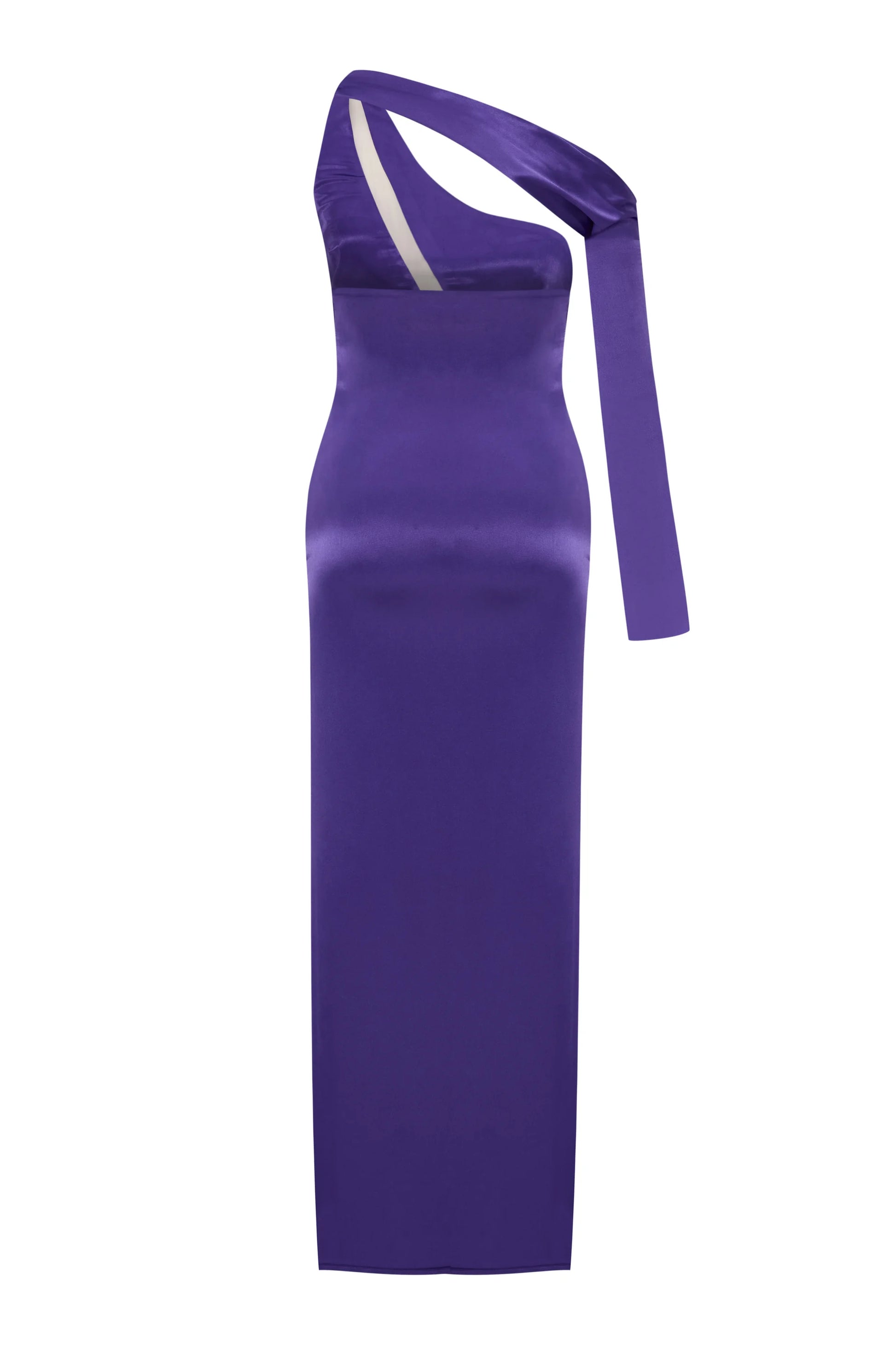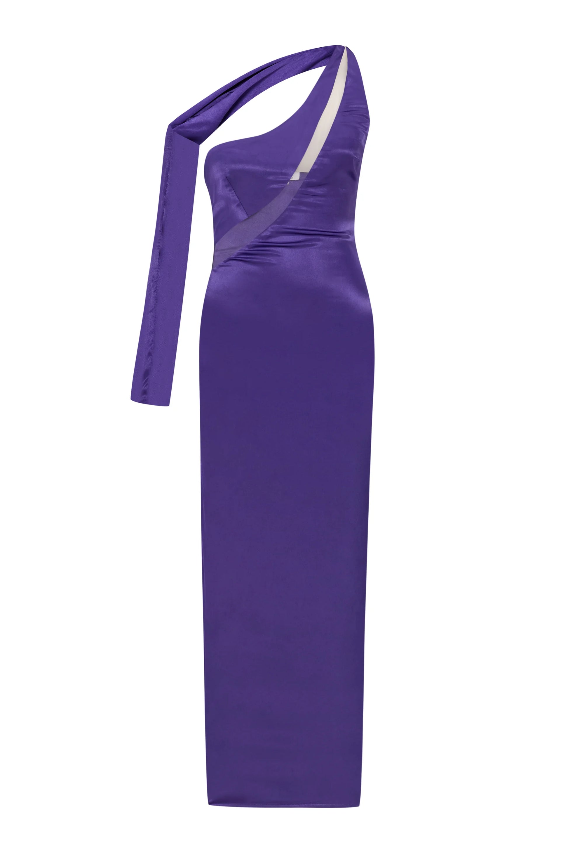 Boyundan uzanan tek kol detayı ile ortadan çapraz şekilde devam eden transparan tül detayı ve vücuda oturan uzun bir elbisedir.