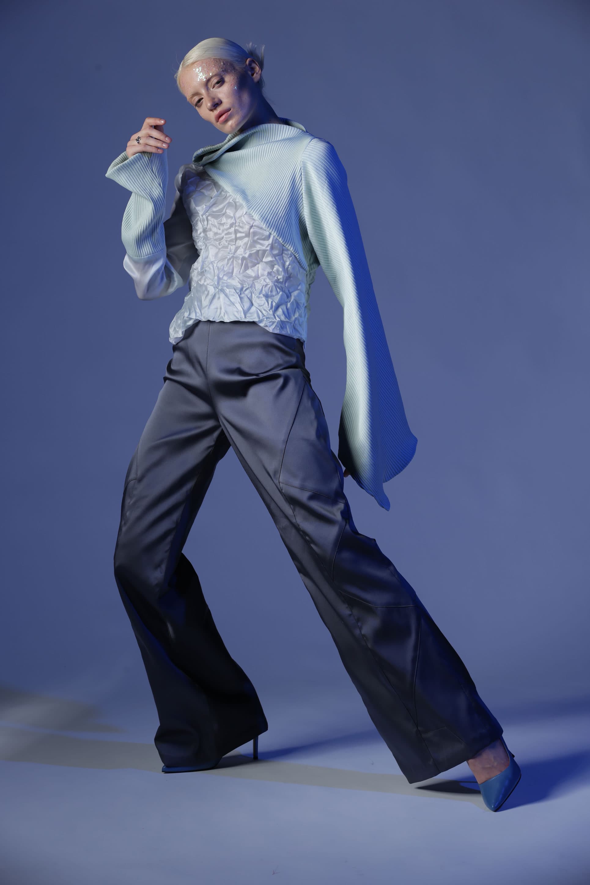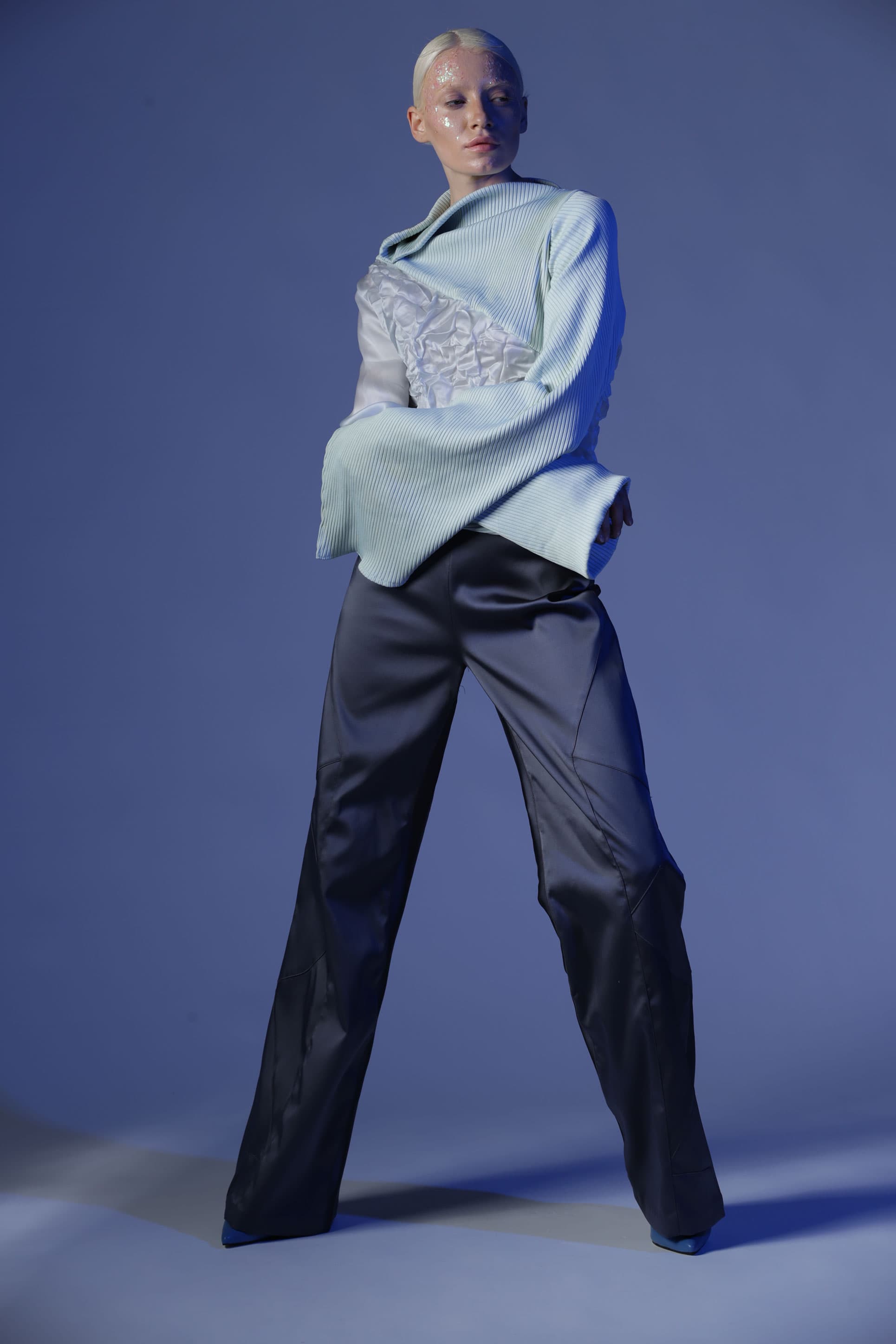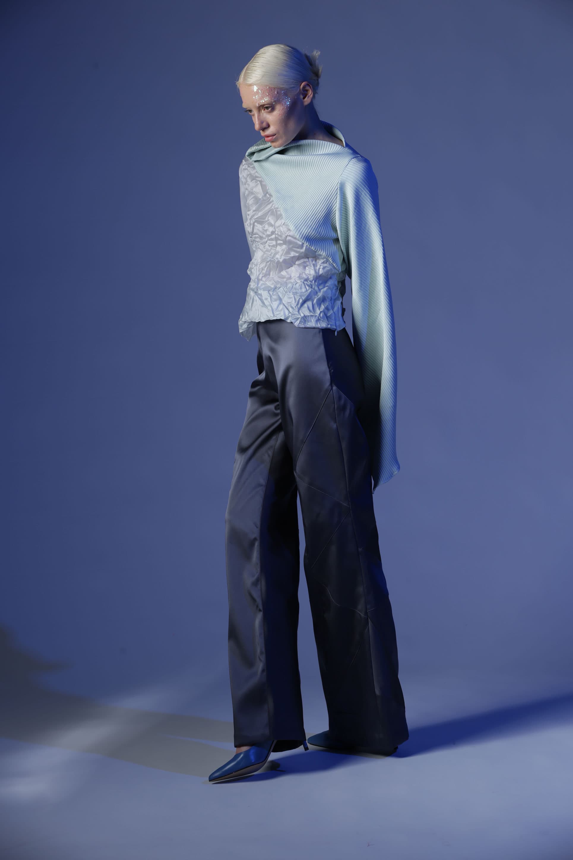 Kintsugi pantolon, antrasit tafta saten kumaştan üretilmiş, şık bir parça ve eksiksiz bir üründür. Bir yapboz parçası gibi, birçok kesilmiş parçayı birleştirip bunları birbirine dikerek oluşturulur.