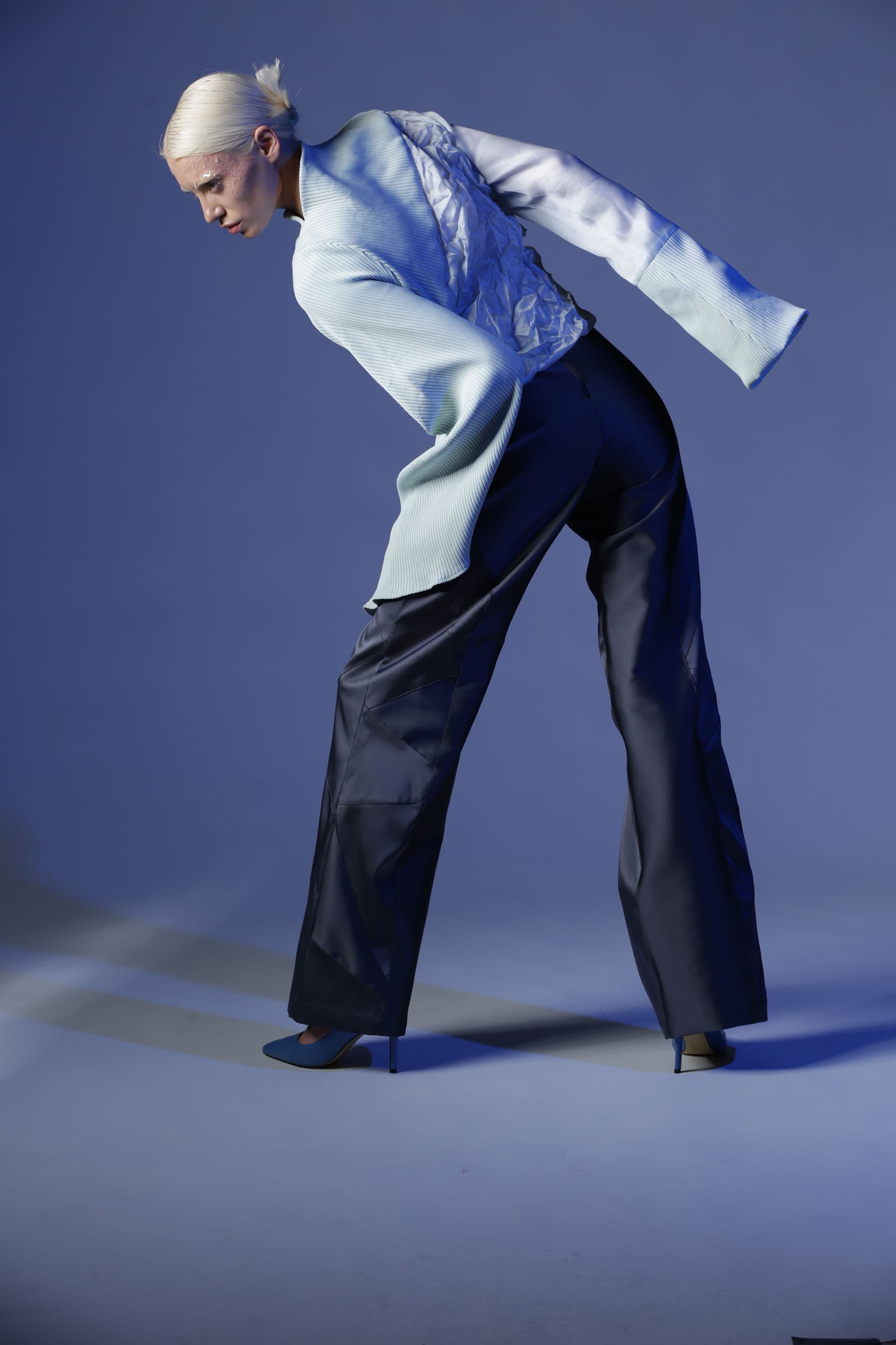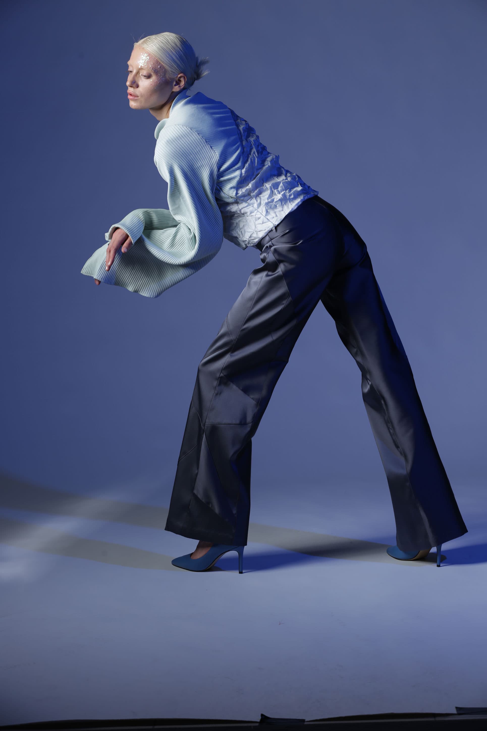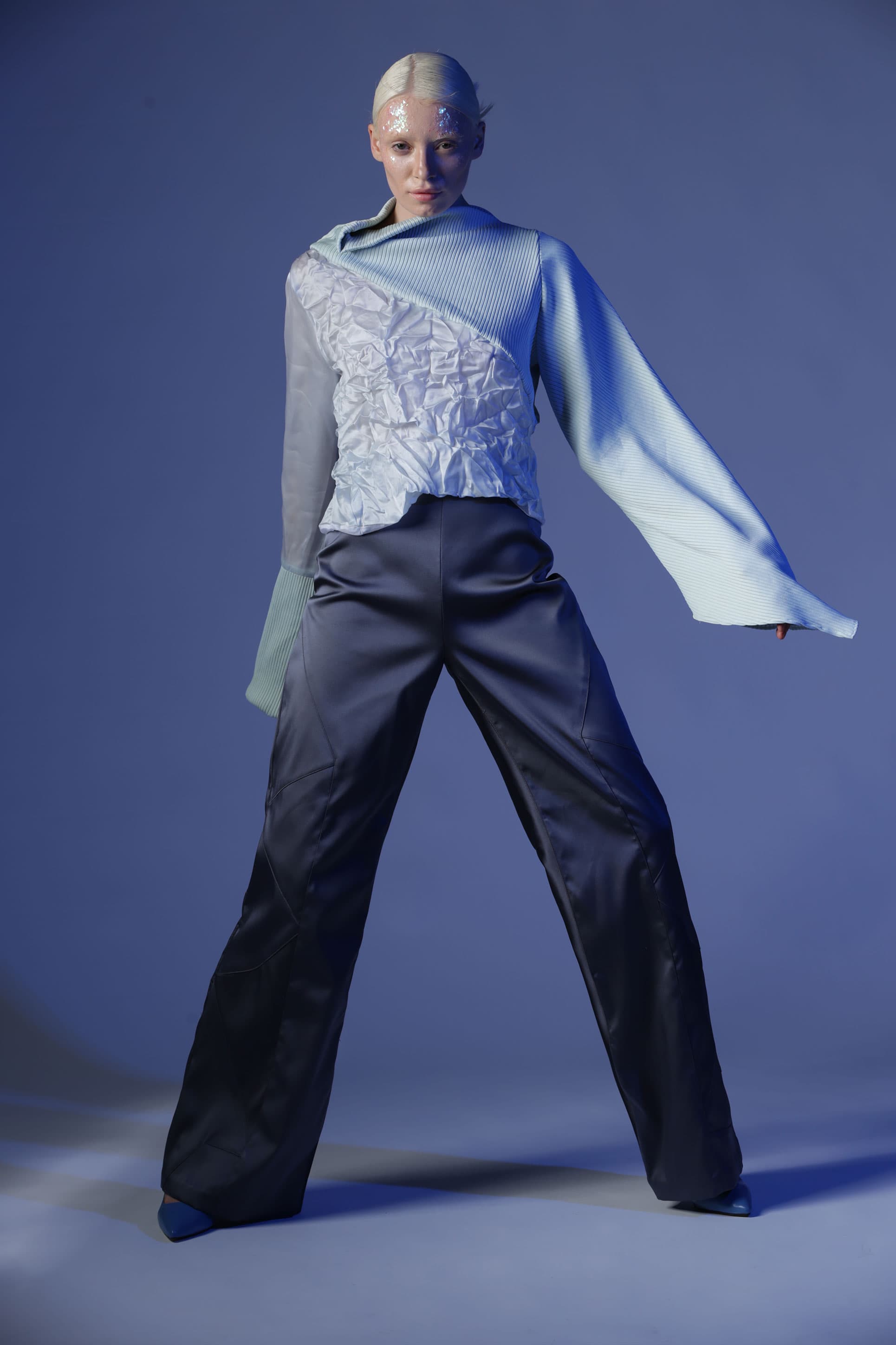 Kintsugi pantolon, antrasit tafta saten kumaştan üretilmiş, şık bir parça ve eksiksiz bir üründür. Bir yapboz parçası gibi, birçok kesilmiş parçayı birleştirip bunları birbirine dikerek oluşturulur.