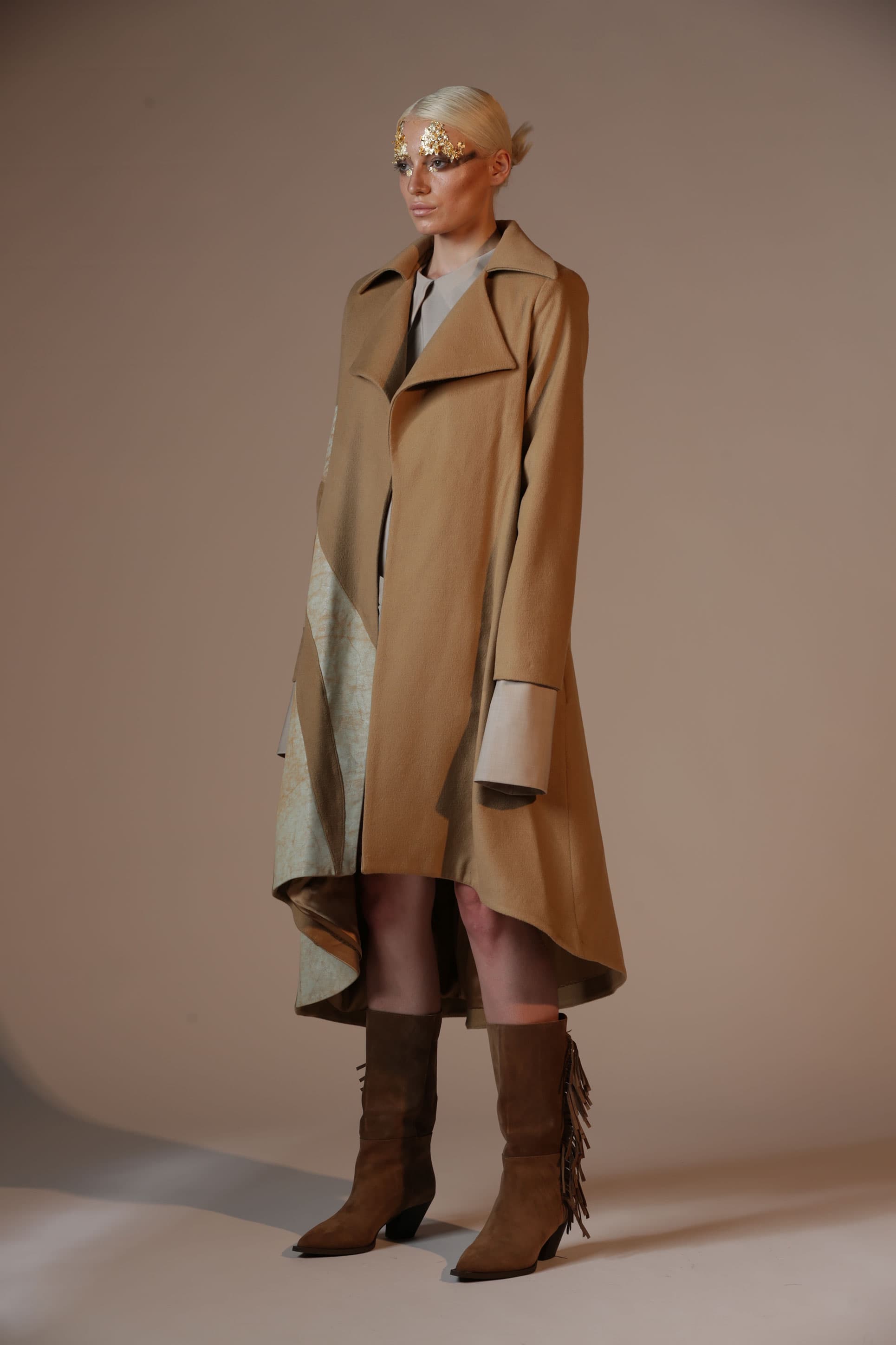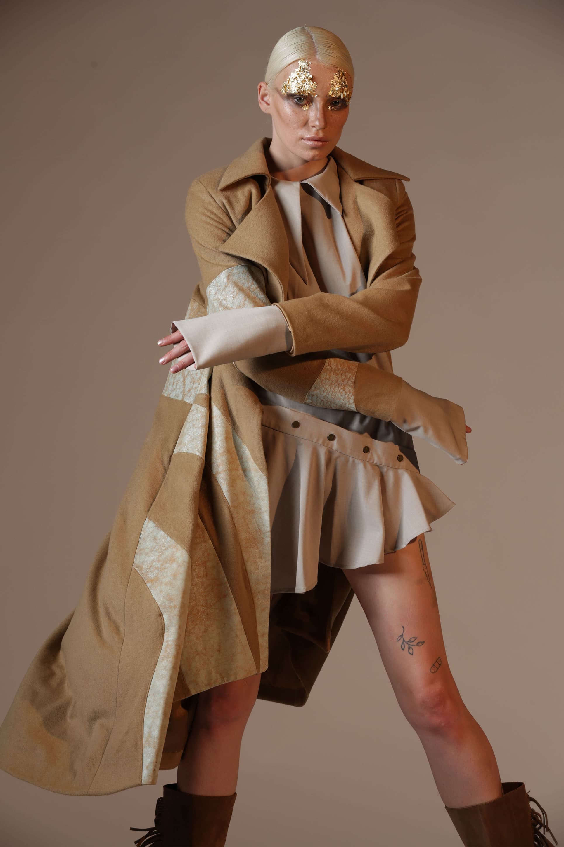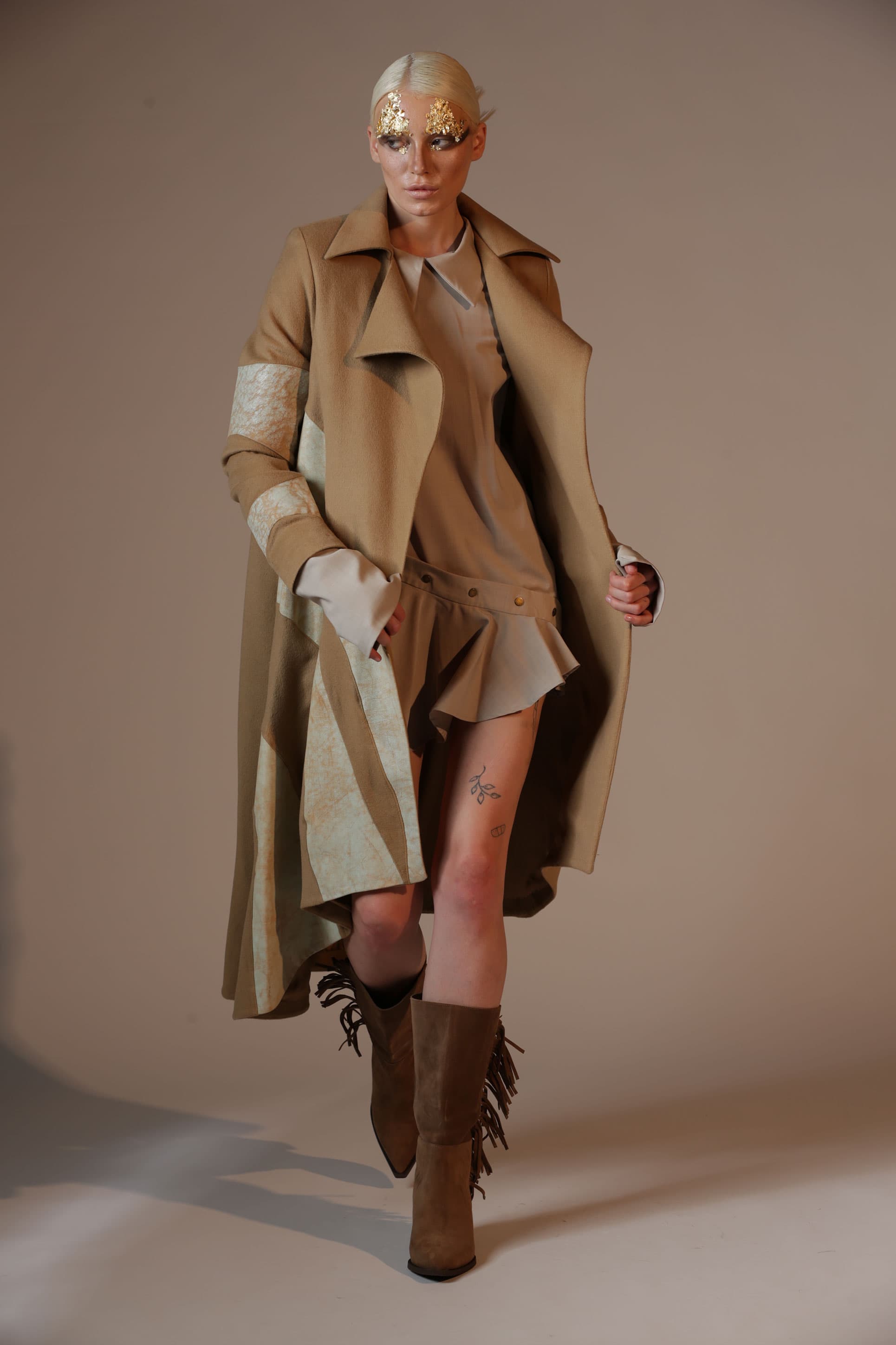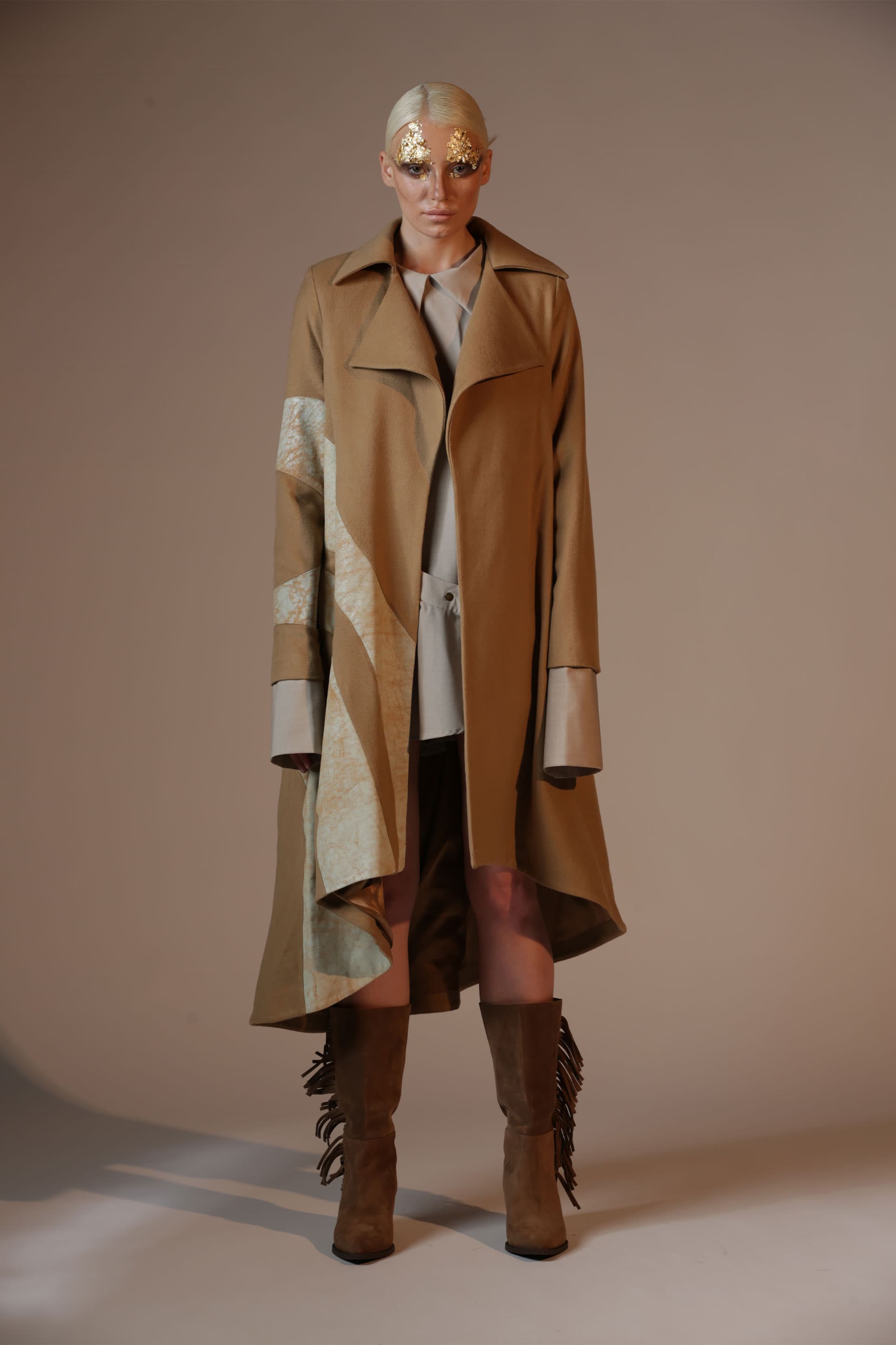 Derinin boyasının çatlatılmasıyla oluşturulan Lagertha, deri detaylı asimetrik kesimlerden oluşuyor . Kollarda ve gövdede yer alan deri detayların devamlılığı bütünlüğün göstergesidir. Klasik tarz, kaşmir ve derinin eşsiz birleşimiyle modern bir parçaya dönüşüyor.