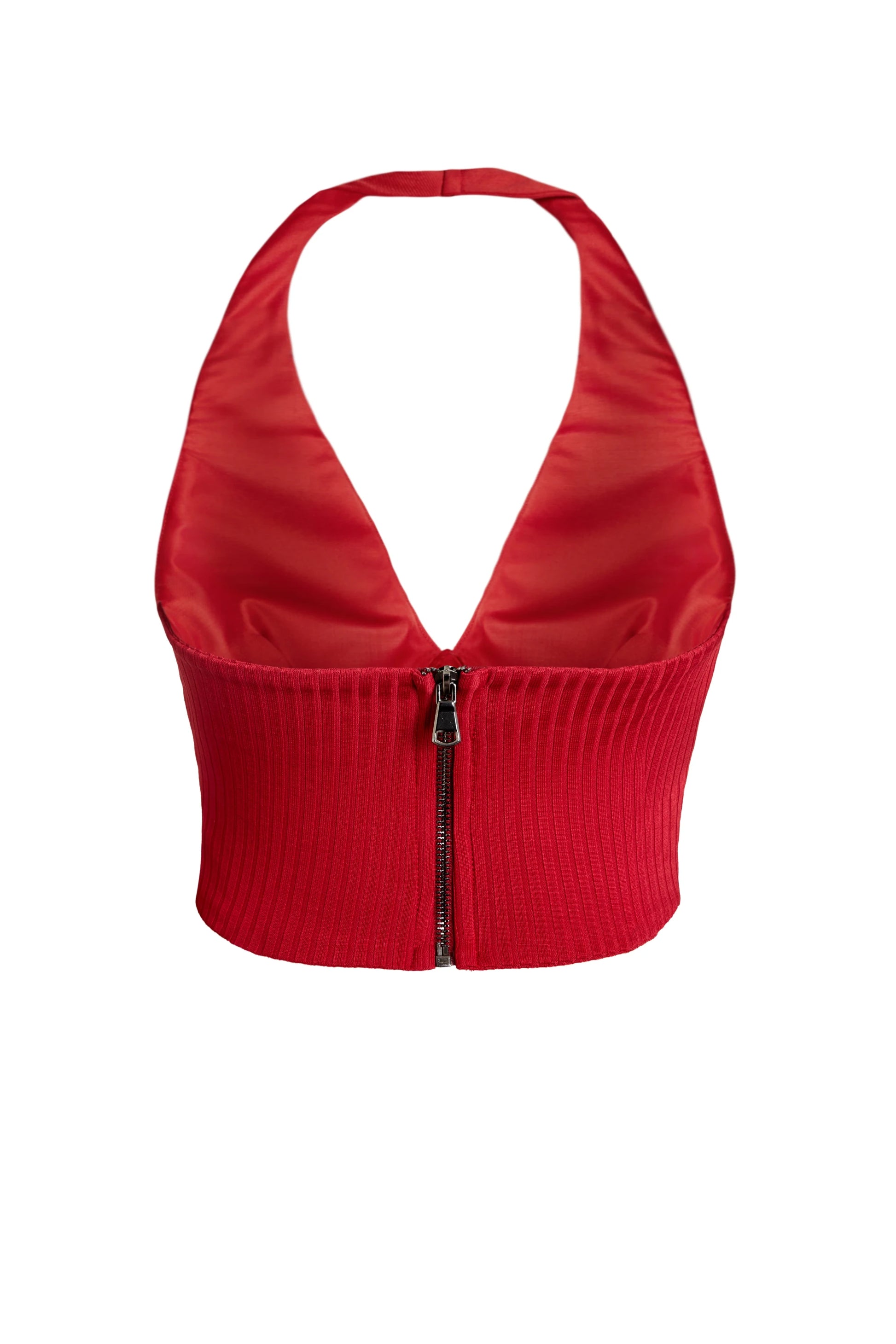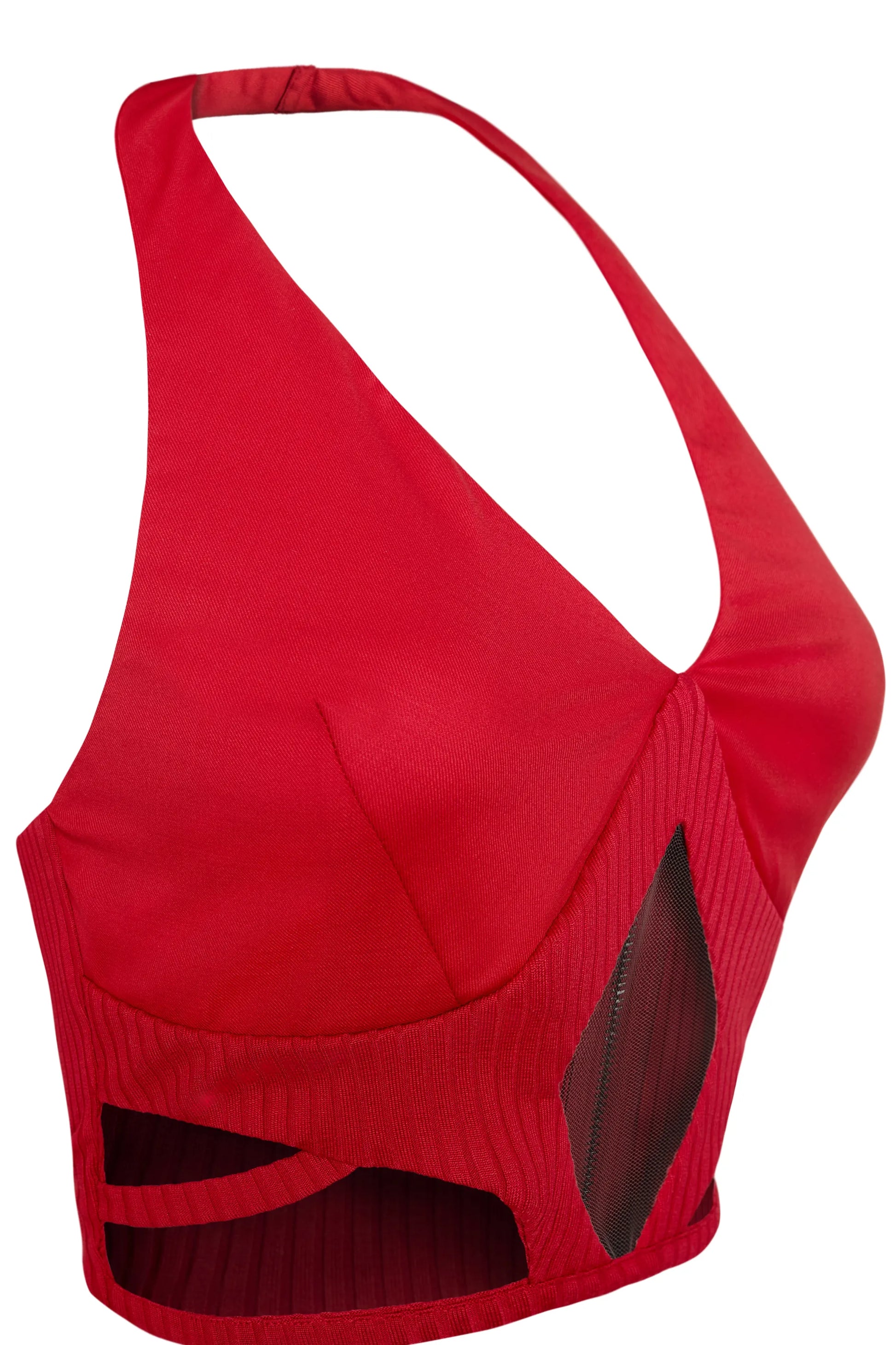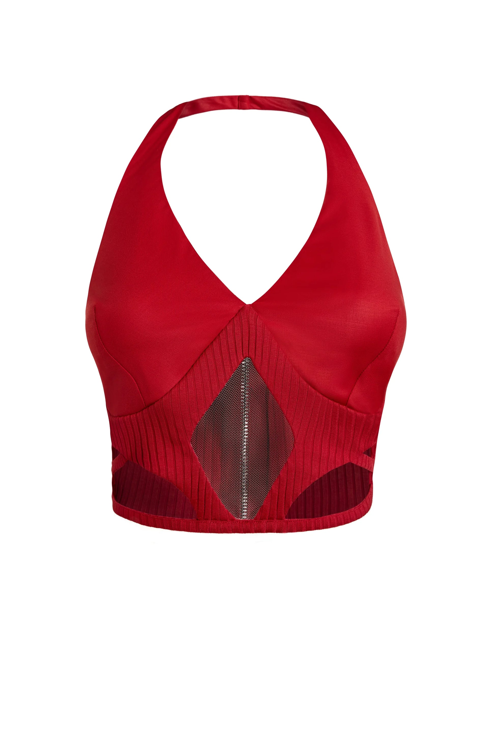 Örme ve dokuma kumaşların bir arada kullanıldığı bu tasarımda üst, boyundan bağlamalı yaka ve açıklık arka ortasından fermuar ile yapılmıştır. Bazı parçalar tamamen elle dikilmiştir. Göğsün dokuma alt kısmında asimetrik kesim parçalar mevcut olup, orta kısımda şeffaf tül kullanılmıştır.